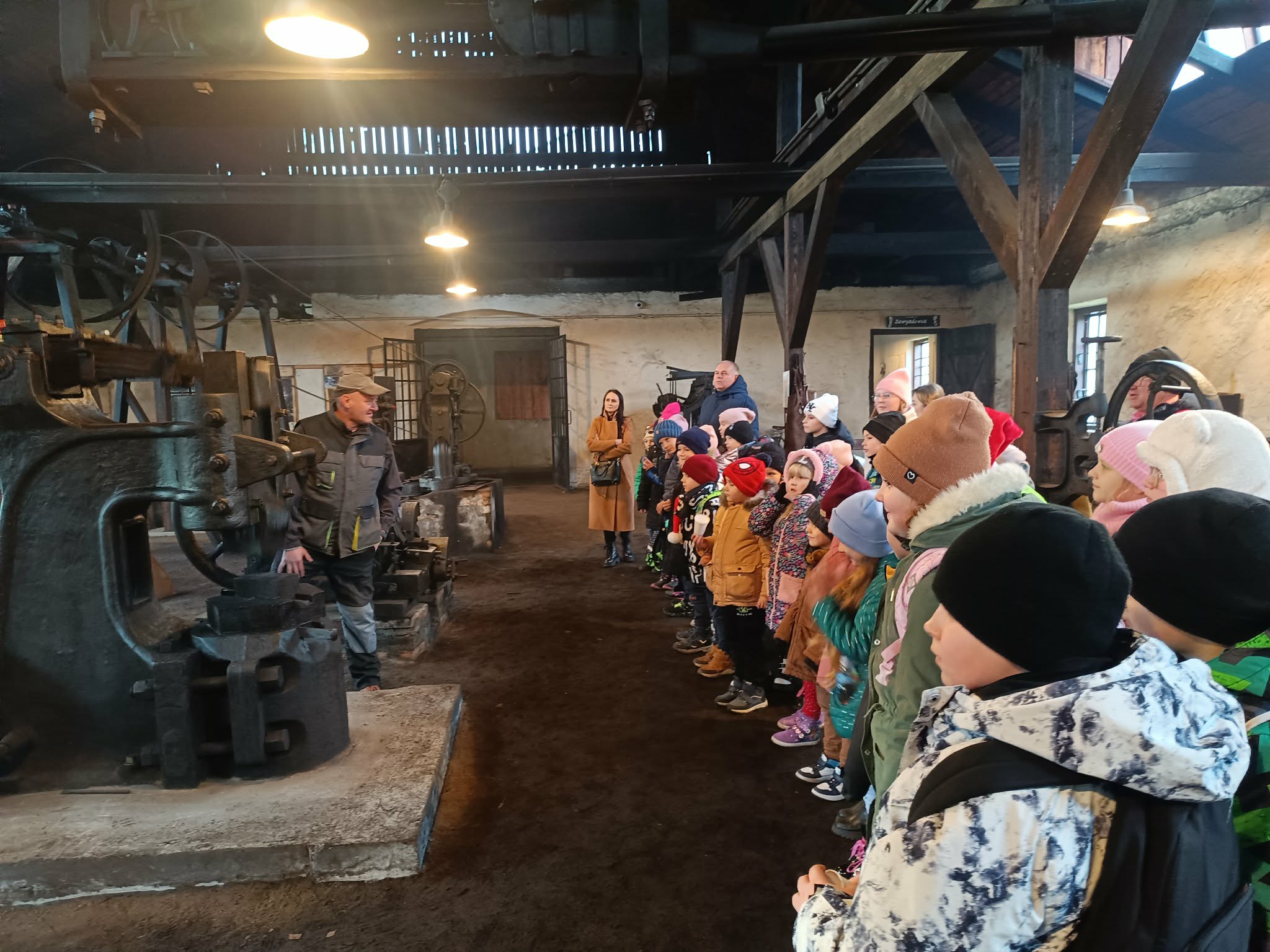 Podczas pobytu uczniowie zwiedzili zabytkowe hale produkcyjne, oglądali koła wodne oraz dawne maszyny napędzające urządzenia hutnicze i kuźnicze. Dowiedzieli się, jak wyglądała praca w zakładzie, skąd pozyskiwano rudę żelaza i jak powstawały wyroby metalowe używane na co dzień – od narzędzi gospodarczych po elementy uzbrojenia.
