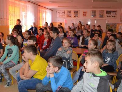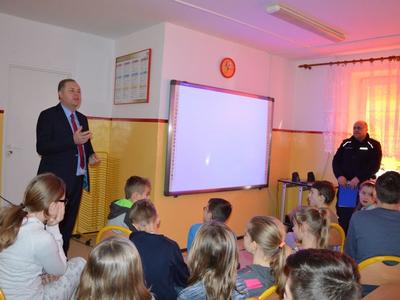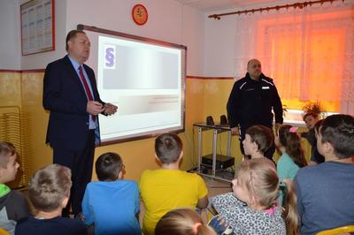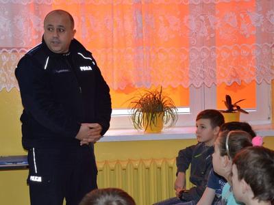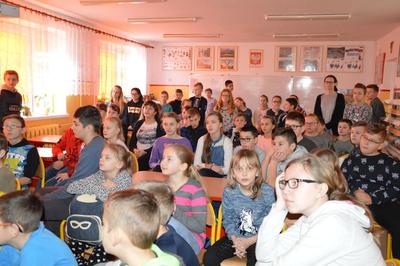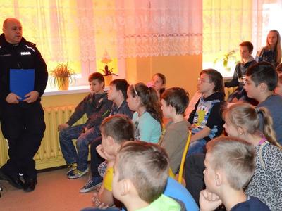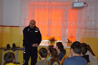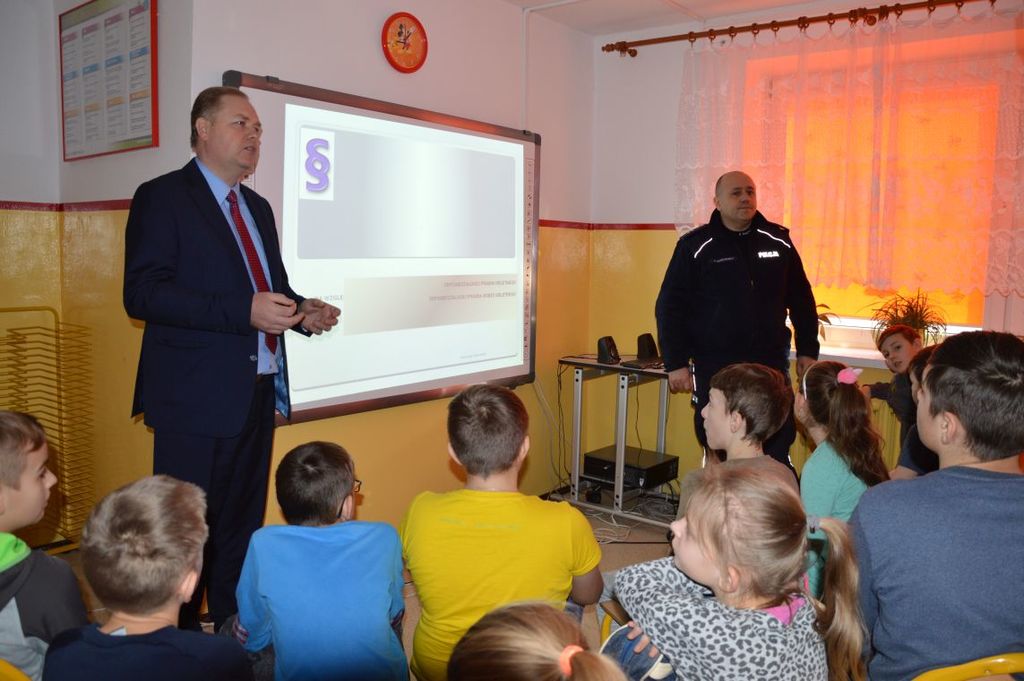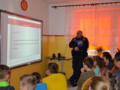 Dnia 8 lutego 2018r. funkcjonariusz policji asp. Sławomir Marchewka przeprowadził pogadankę profilaktyczną z uczniami klas IV-VII. Przewodnią myślą pogadanki połączonej z prezentacją multimedialną była odpowiedzialność karna nieletnich za ich zachowania i działania w różnych miejscach, także w szkole. Głównym celem spotkania było zapoznanie dzieci i młodzieży z najważniejszymi przepisami zawartymi w Ustawie o Postępowaniu w Sprawach Nieletnich dotyczących przeciwdziałania wszelkim objawom demoralizacji i przestępczości osób nieletnich. Policjant uświadamiał młodzieży jakie konsekwencje ponoszą w momencie popełniania czynów zabronionych takich jak: kradzież, wagary, pobicie, posiadanie i handel narkotykami czy dopalaczami. Omówił także jakie środki wychowawcze może stosować sąd. Funkcjonariusz również mocno podkreślił fakt, że wagary i nie realizowanie obowiązku szkolnego przez nieletniego również podlegają postępowaniu przed sądem. Pouczył o odpowiedzialności karnej za używanie słów wulgarnych w miejscach publicznych, odpowiedzialności za wymuszenia i rozboje; za niszczenie mienia publicznego i społecznego, a nawet i wagarowanie. Sporo czasu pan policjant poświęcił zjawisku cyberprzemocy, nakłaniał także do rozważnego zamieszczania wszelkich informacji, czy fotografii na portalach internetowych.