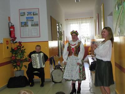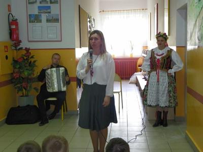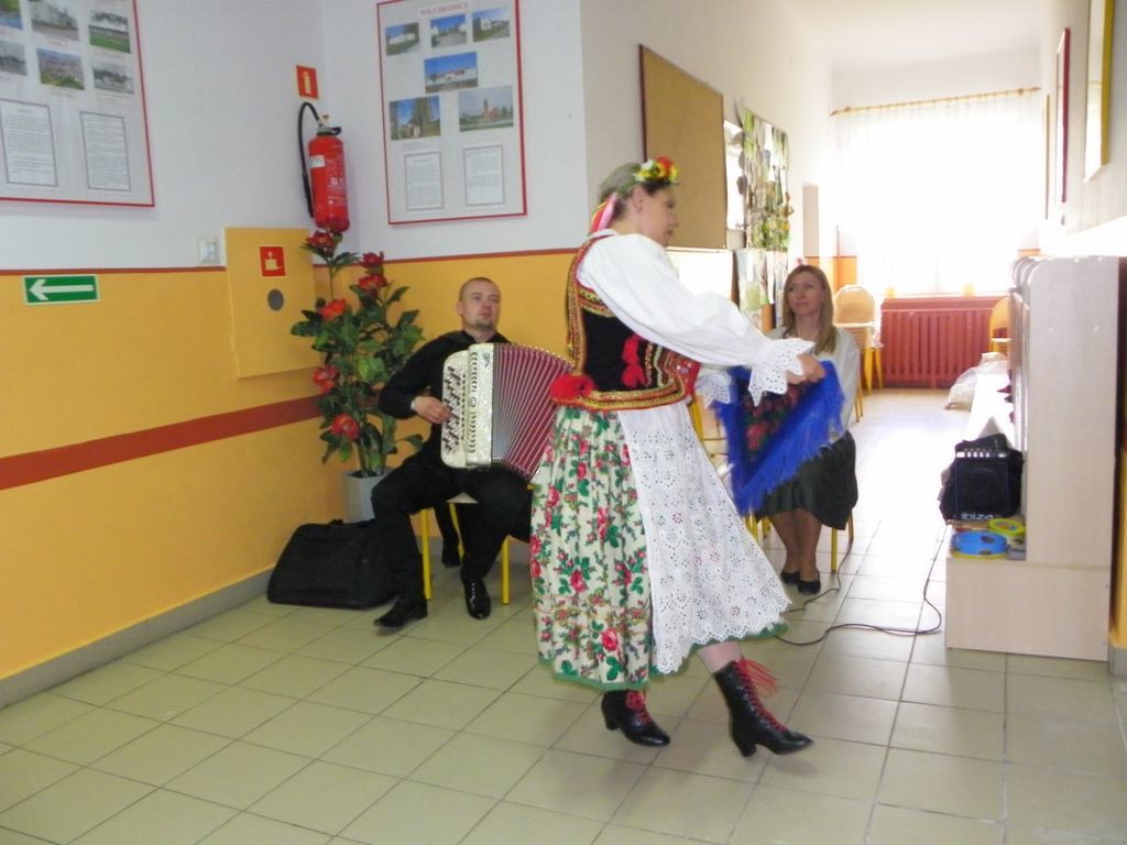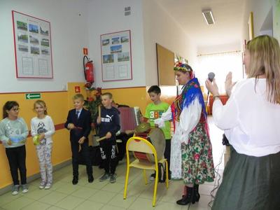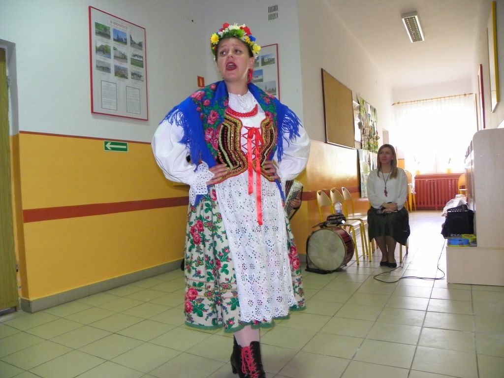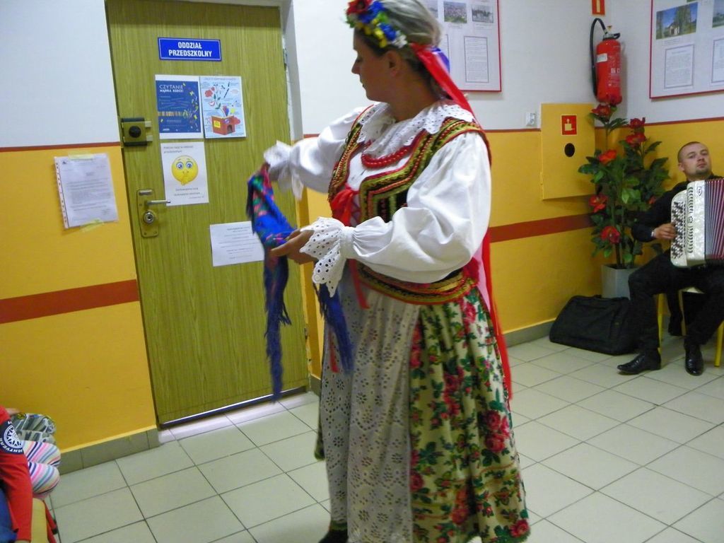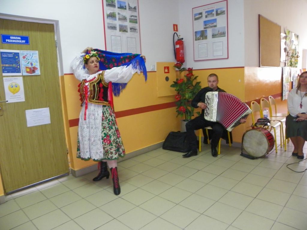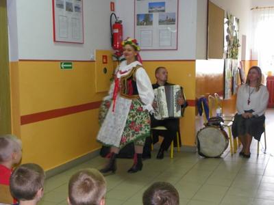 Uczniowie poznali elementy stroju łowickiego, w skład którego wchodziły: zapaska, pasiak, kolorowa spódnica w kwiaty, biała koszula, gorset z haftowanym zdobieniem (które w dużej mierze zależało od zamożności) oraz czerwone korale. Strój był ubierany od święta i przekazywany z pokolenia na pokolenie. Do dziś pozostały nam barwne wycinanki łowickie. Muzyka tego regionu była bardzo ciekawa. Wzorował się na niej słynny kompozytor Fryderyk Chopin. Z Łowicza pochodzi taniec zwany oberkiem. Jest szybki, skoczny i wymaga dużo siły. Jego kroki zaprezentowała zgromadzonym p. Agnieszka Adamczyk.