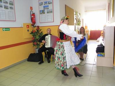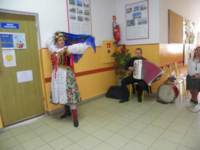 Z Kujaw przenieśliśmy się do Krakowa - dawnej stolicy naszego kraju. Poznaliśmy strój ludowy krakowski, który jest barwny: spódnica kwiecista, na niej fartuszek haftowany z takim samym motywem jak kołnierz i mankiety przy koszuli, gorset czarny bogato zdobiony cekinami, na głowie wianek z kolorowych kwiatkami i barwnymi wstążkami z tylu. Strój panów charakteryzowała czerwona czapka z piórem. Tańcem narodowym pochodzącym z tego regionu jest krakowiak, żywy, skoczny i posiadający swoje nazwy lokalne np.: mijany, dreptany, ścigany, skalmierzak i przebiegany. Chętni uczniowie zatańczyli wspólnie z panią A. Adamczyk krakowiaka, wykonując jego kroki w takt muzyki.