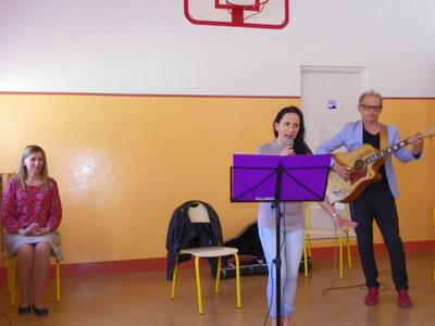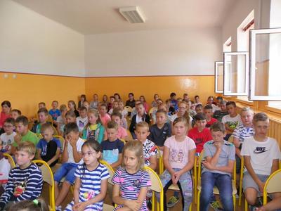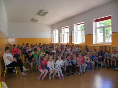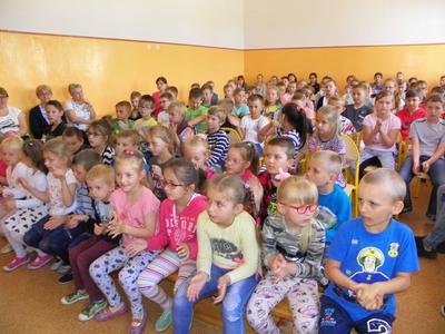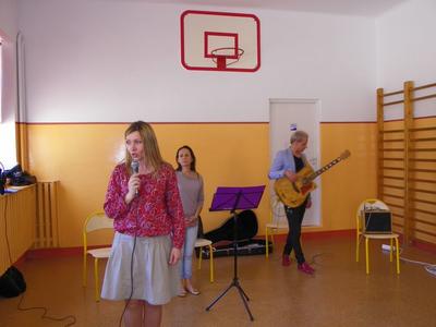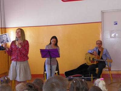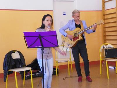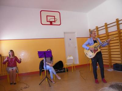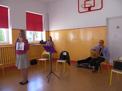 W dniu 24 maja naszą szkołę odwiedzili muzycy z Filharmonii Świętokrzyskiej. W swym koncercie zaprezentowali piosenki Agnieszki Osieckiej. Prowadząca p. Agnieszka Nowak - Zagóra przedstawiła krótką biografię Agnieszki Osieckiej - autorki wielu piosenek m.in. "Małgośka". Uczniowie poznali instrument muzyczny noszący nazwę marimba, który podobny jest do ksylofonu. Posiada on jednak szersze i cieńsze niż ksylofon drewniane sztabki oraz niższy rejestr gry. Gra się na nim pałkami. Następnie społeczność szkolna wysłuchała dźwięków gitary, na której p. Piotr Restecki zaprezentował "Libretto do opery" oraz muzykę do filmu "Różowa Pantera". Dzieci dowiedziały się również, jaka jest różnica między gitarą klasyczną a akustyczną. Solo zaśpiewała p. Justyna Łysak, wspaniale bawiąc zgromadzonych piosenkami Maryli Rodowicz "Dziś prawdziwych Cyganów już nie ma..." oraz "Dla niej diabeł, dla niej raj". Na zakończenie tego miłego spotkania wysłuchaliśmy piosenkę Majki Jeżowskiej "A ja wolę moją mamę". Wszyscy gromkimi brawami nagrodzili muzyków.