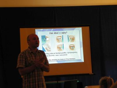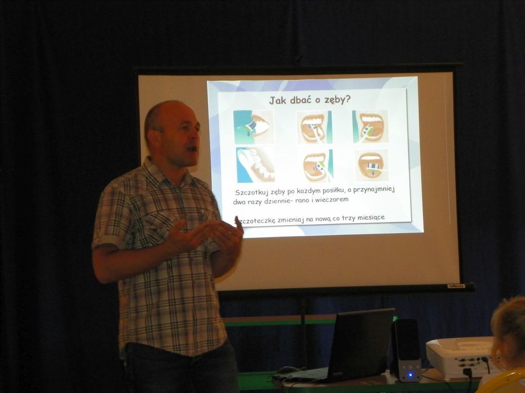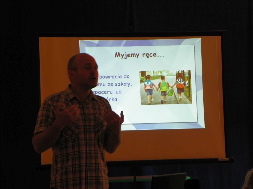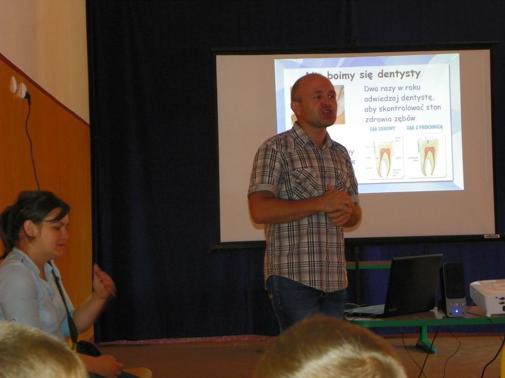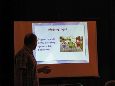Dnia 04.06.2018r. rozpoczęły się Szkolne Dni Profilaktyki. Naszą szkołę odwiedził przedstawiciel Powiatowej Stacji Sanitarno-Epidemiologicznej w Końskich, p. M. Szyposzyński. Przeprowadził prelekcję multimedialną z dziećmi z oddziału przedszkolnego i klas I-III pt.„Dbam o higienę” i ,,Właściwe odżywianie”. Najmłodsi mieli okazję przypomnieć sobie zasady higieny dla poszczególnych części ciała oraz wzbogacili swoją wiedzę z zakresu zasad zdrowego odżywiania. Głównym celem wizyty było poszerzenie wiedzy na temat własnego zdrowia, jak o nie dbać (zdrowe odżywianie, codzienne spacery, dbanie o higienę osobistą), czego się wystrzegać i unikać, aby żyć zdrowo i prawidłowo się rozwijać. W ciekawy sposób pokazano jak prawidłowo powinniśmy przechowywać żywność w lodówce, o czym nie zapominać robiąc zakupy, jak czytać etykiety na produktach żywnościowych. Pan Marcin wyjaśnił, dlaczego chipsy i napoje energetyzujące są niezdrowe.
