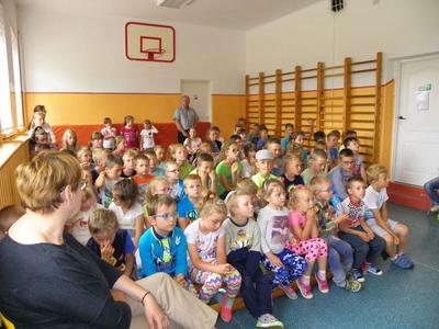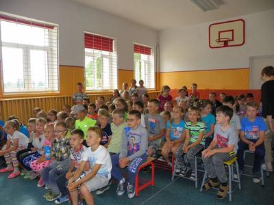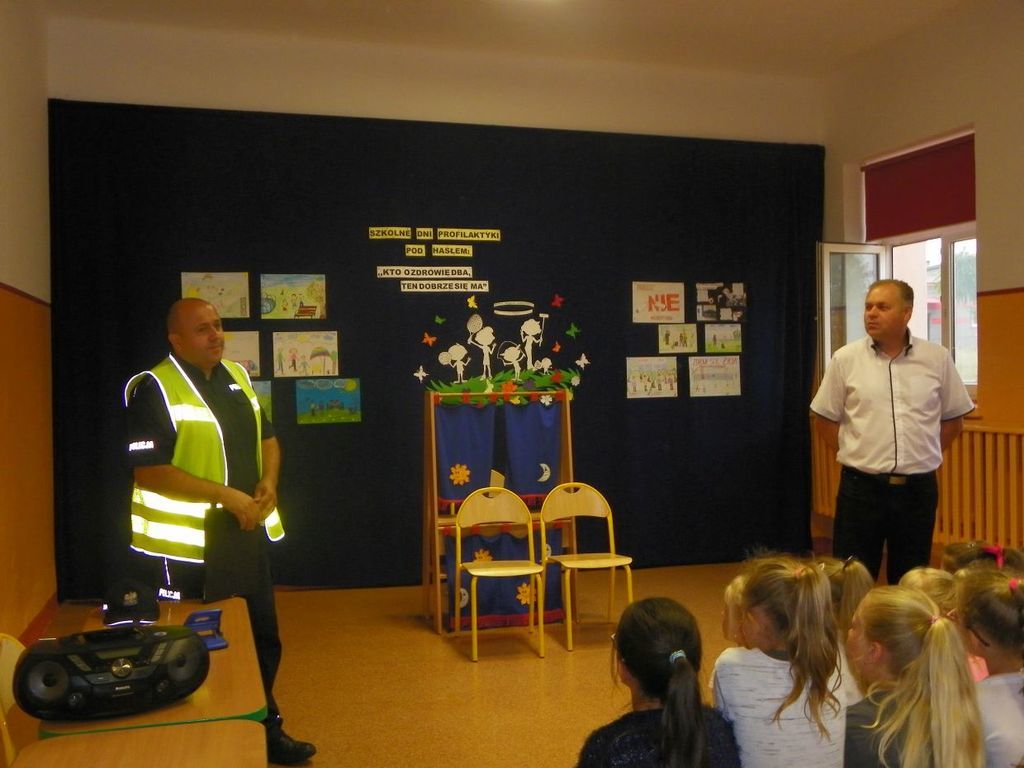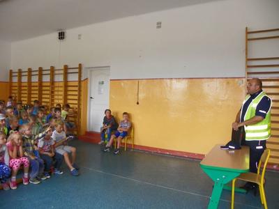 W dniu 11 czerwca 218r. szkołę odwiedził przedstawiciel Policji, który poruszył temat bezpieczeństwa w czasie wakacji. Celem spotkania było kształtowanie prawidłowych zachowań oraz postaw wśród uczniów. Funkcjonariusz policji przypomniał dzieciom zasady bezpiecznego poruszania się po drodze, prawidłowego przejścia przez jezdnię, omówił jak zachować się, gdy zaczepi nas obca osoba lub gdy się zgubimy, przypomniał dzieciom zasady bezpieczeństwa podczas zabawy w domu i na podwórku. Policjant przestrzegał również uczniów przed korzystaniem z niestrzeżonych kąpielisk, rozpalaniem ognisk, organizowaniem zabaw w niebezpiecznych miejscach. Kształtowanie wśród uczniów podstawowych zasad bezpiecznego zachowania się nad wodą, na drodze, w górach, uwrażliwienie na różne niebezpieczeństwa oraz doskonalenie wyobraźni i myślenia przyczynowo-skutkowego mającego prowadzić do zmniejszenia wypadków.