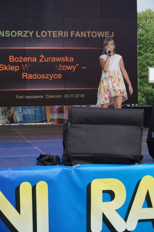 W niedzielę 29 lipca 2018 r. zgodnie z coroczną tradycją odbył się w Radoszycach na stadionie festyn rodzinny pod hasłem: ,,Radoszyczanie Dzieciom”. Jest to impreza, podczas której od lat cała społeczność tej gminy poprzez wspólną zabawę zbiera pieniądze na rzecz chorych dzieci i poszkodowanych osób ze swojej gminy. W tym roku święto było podwójne, ponieważ Radoszyce uczciły także odzyskanie praw miejskich. O godzinie 14.30 rozpoczęły się występy uczniów poszczególnych Szkół Podstawowych Miasta i Gminy Radoszyce. Uczniowie naszej szkoły przygotowani pod kierunkiem nauczycielki – Krystyny Kowalczyk zaprezentowali licznie zgromadzonej publiczności piosenki oraz tańce dyskotekowe. Wystąpiły następujące uczennice: Klaudia Mazur, Natalia Mazur - wokal oraz zespoły taneczne klasy IV( Paulina Dębska, Magdalena Szustak , Aleksandra Ciszek, Natalia Mazur) oraz kl. VI (Weronika Staciwa, Amelia Kiełbus, Patrycja Podstawka, Julia Kotwica, Hubert Szustak) . Występy zostały nagrodzone brawami oraz słodkim poczęstunkiem. Na koniec występów pan Burmistrz Michał Pękala podziękował wszystkim uczniom oraz opiekunom za aktywny udział, zaangażowanie oraz obecność na festynie.