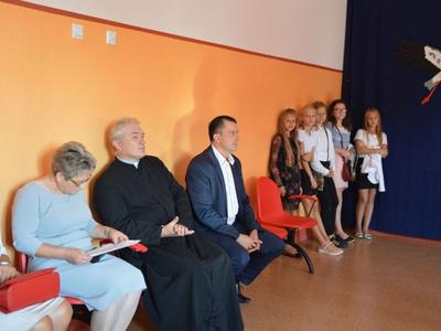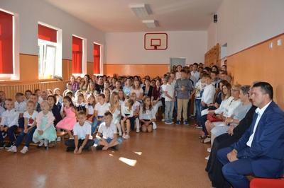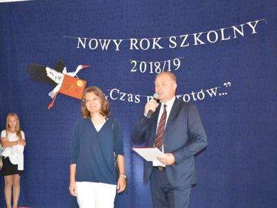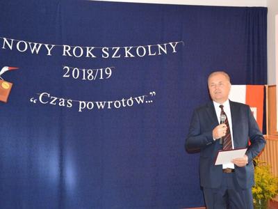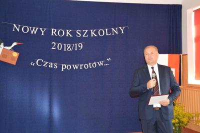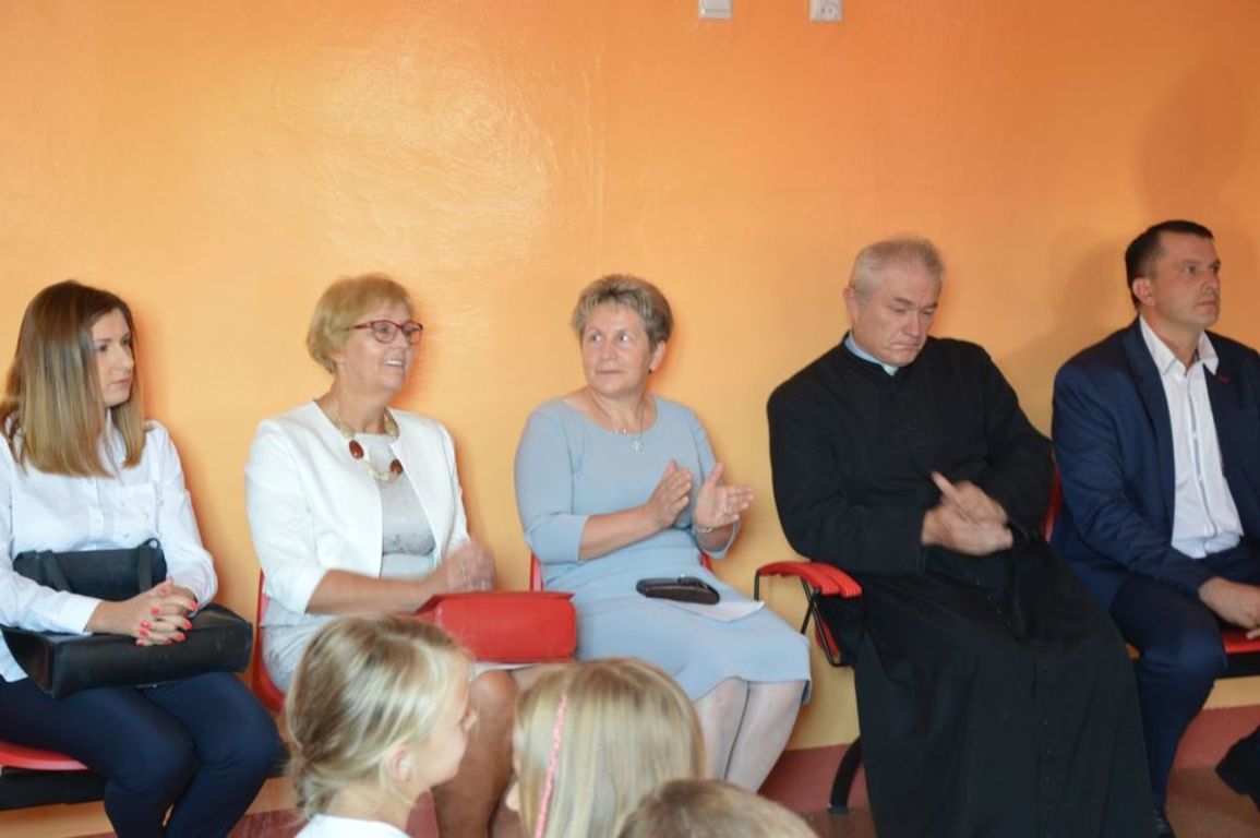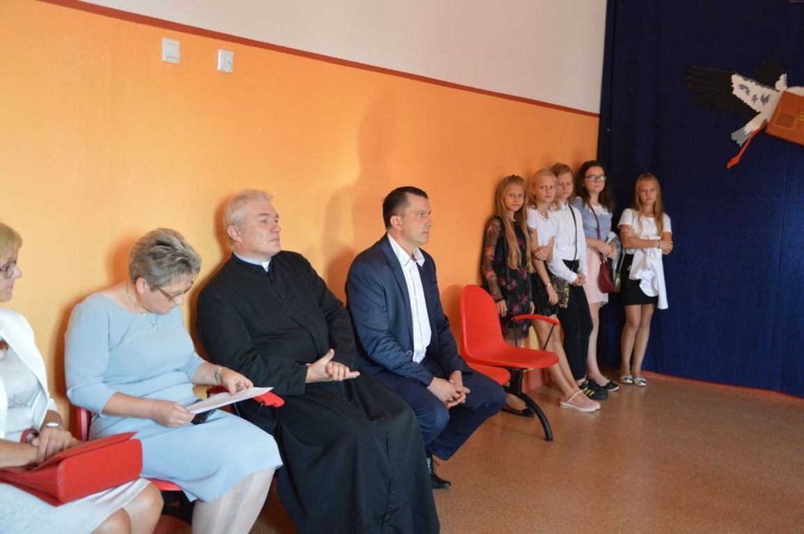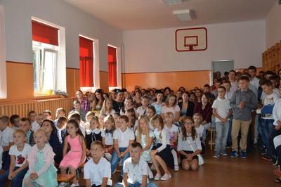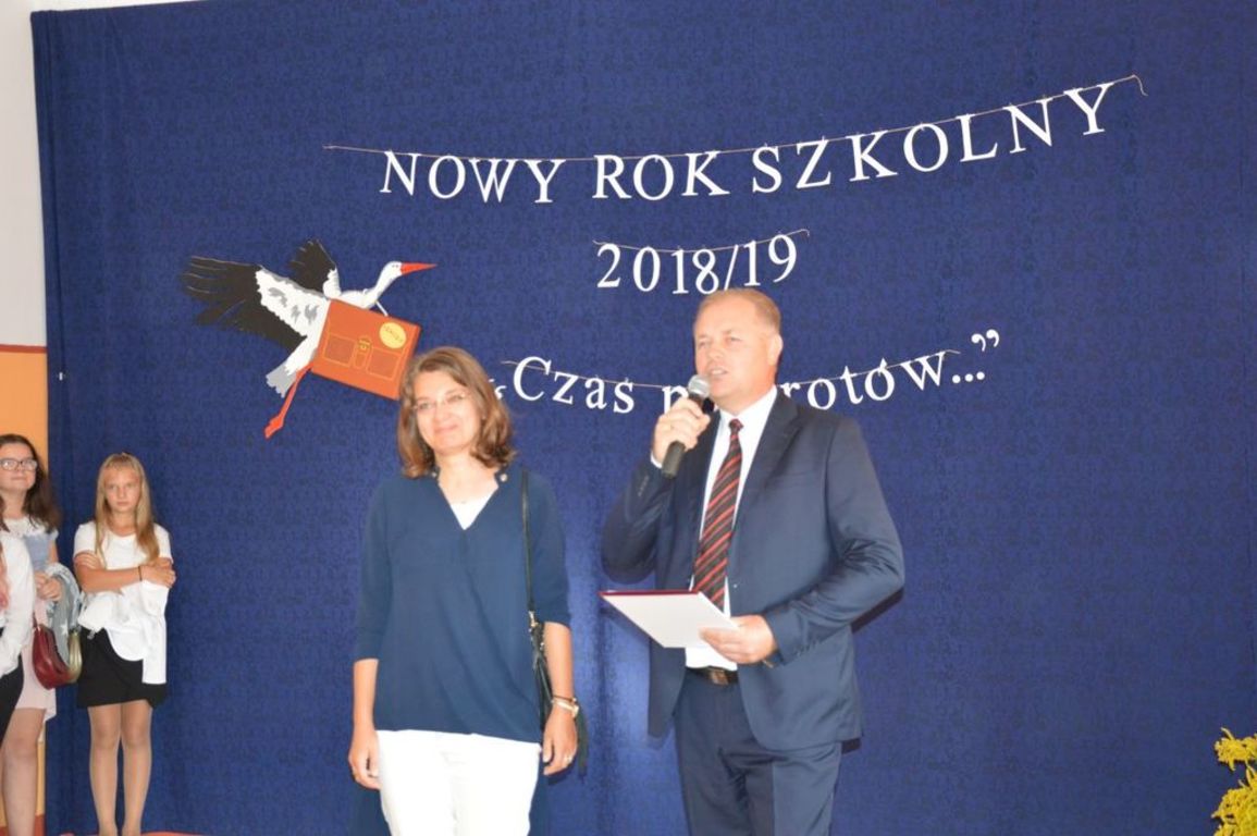 W dniu 3 września 2018 r. odbyło się uroczyste rozpoczęcie roku szkolnego 2018/2019. O godz. 8.00 ks. proboszcz Paweł Bukała odprawił Mszę Świętą. Grono Pedagogiczne i dzieci wraz z rodzicami, zebranych w sali gimnastycznej, przywitał Dyrektor Szkoły - dr Zbigniew Kowalczyk. Pan Dyrektor ciepłe słowa skierował do przybyłych gości, rodziców i dzieci. Przedstawił nowych nauczycieli oraz wychowawców poszczególnych klas. Serdeczne podziękowania skierował do Burmistrza Pana Michała Pękali, dziękując za pomoc w pracach inwestycyjno - remontowych w czasie wakacji. Nawiązał także do zbliżającej się uroczystości stulecia szkoły oraz nadania jej im. św. Jana Pawła II. Następnie głos zabrał Zastępca Burmistrza Pan Grzegorz Pakuła, nadmieniając o projekcie budowy sali gimnastycznej przy szkole oraz sfinalizowanym projekcie pod nazwą "Wsparcie kształcenia podstawowego w zakresie kompetencji kluczowych", dzięki któremu szkoła zostanie doposażona w pomoce dydaktyczne, natomiast uczniowie będą mieli dodatkowe zajęcia pozalekcyjne. Pan Dyrektor oraz przybyły gość wszystkim uczniom życzyli wielu sukcesów w nowym roku szkolnym, nauczycielom wytrwałości, a rodzicom satysfakcji z osiągnięć swoich dzieci.