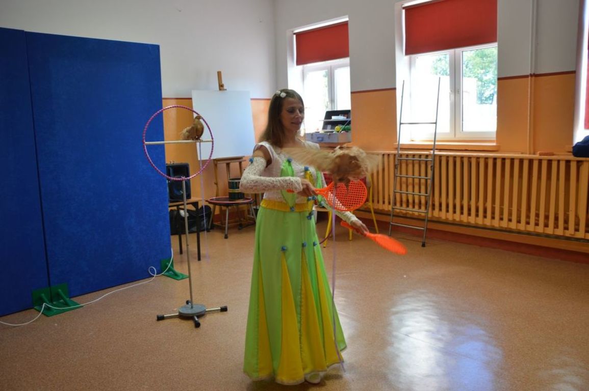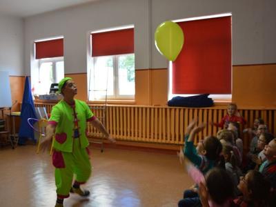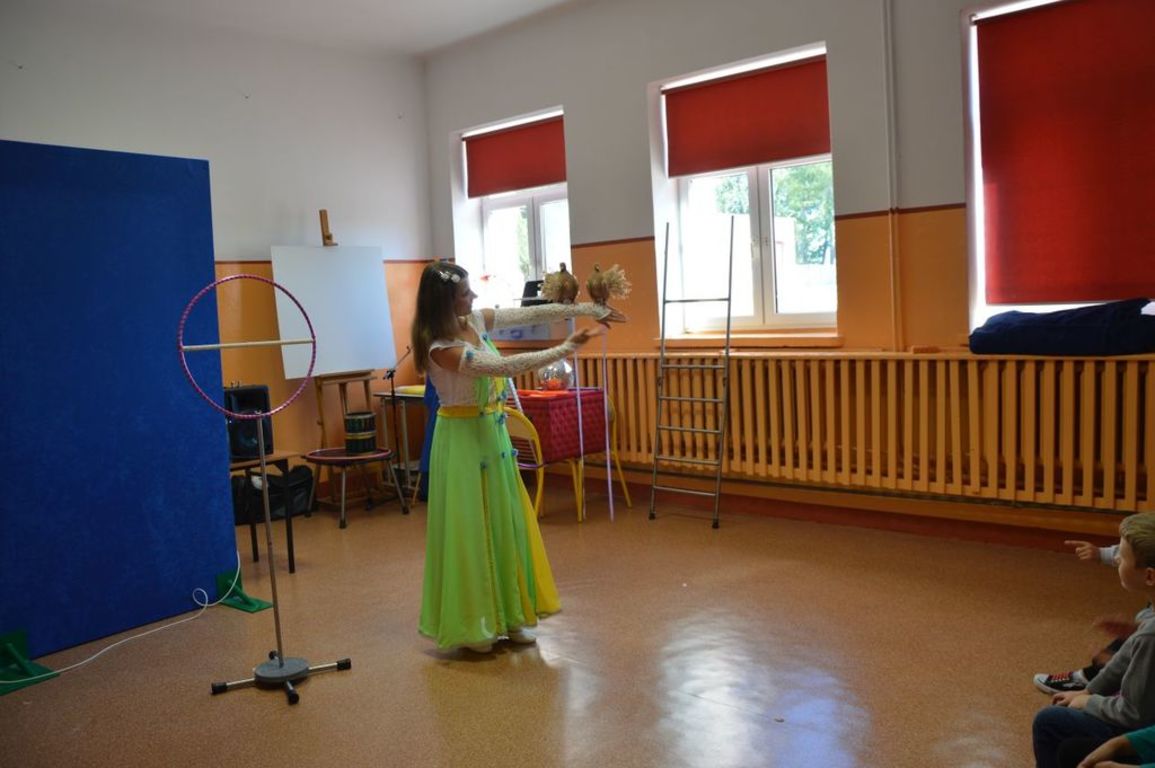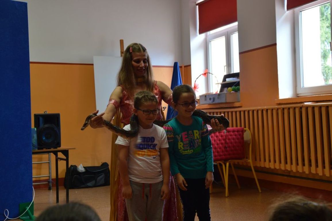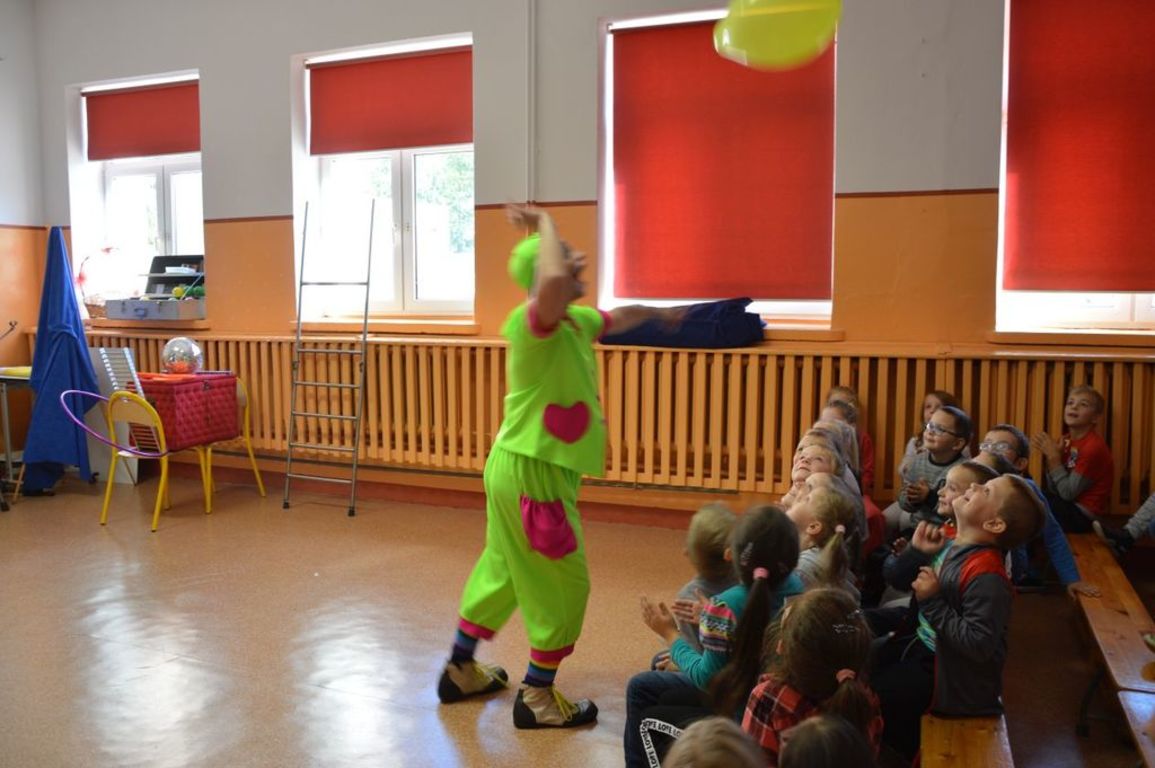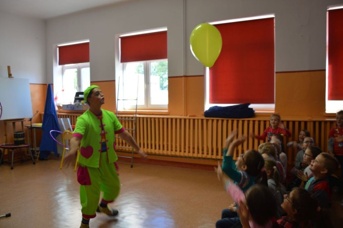 Dnia 28.09.2018 r. o godz. 10.00 mieliśmy niebywałą okazję gościć, na naszej sali gimnastycznej, artystów z cyrku SZOK, którzy sprawili, że wszyscy oglądający przedstawienie bawili się doskonale. Najważniejszą osobą był oczywiście klaun, który rozbawiał publiczność swoimi występami. Aplauz wybuchał, gdy na scenę, do wspólnej zabawy zapraszał dzieci. Nie zabrakło także chwil "grozy", kiedy pojawiła się treserka z wężem na ramionach. Okazało się szybko, że jest on niegroźny i chętnych do dotknięcia, czy potrzymania gada, było wielu. Obejrzeliśmy także popisy akrobatyczne i żonglerkę. Zachwyt najmłodszych uczniów wzbudził pokaz tresowanych gołębi. Nie zawiodła również sztuka iluzji i trików, a mianowicie czarowanie chusteczkami. Kręcenie hula hop okazało się również świetną zabawą dla śmiałków biorących udział w rozrywce.