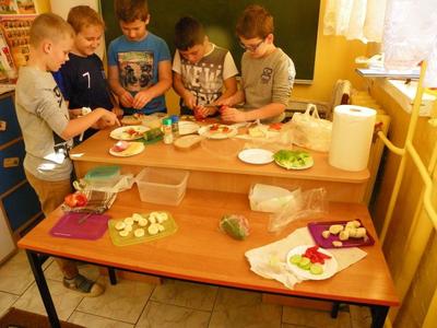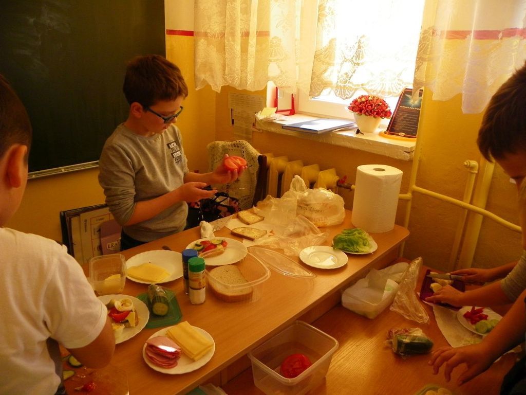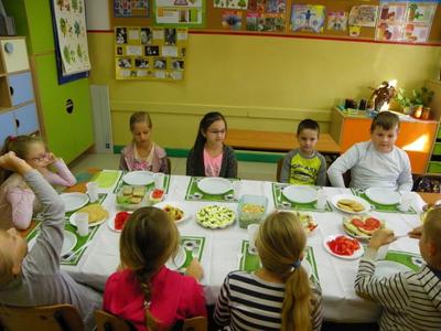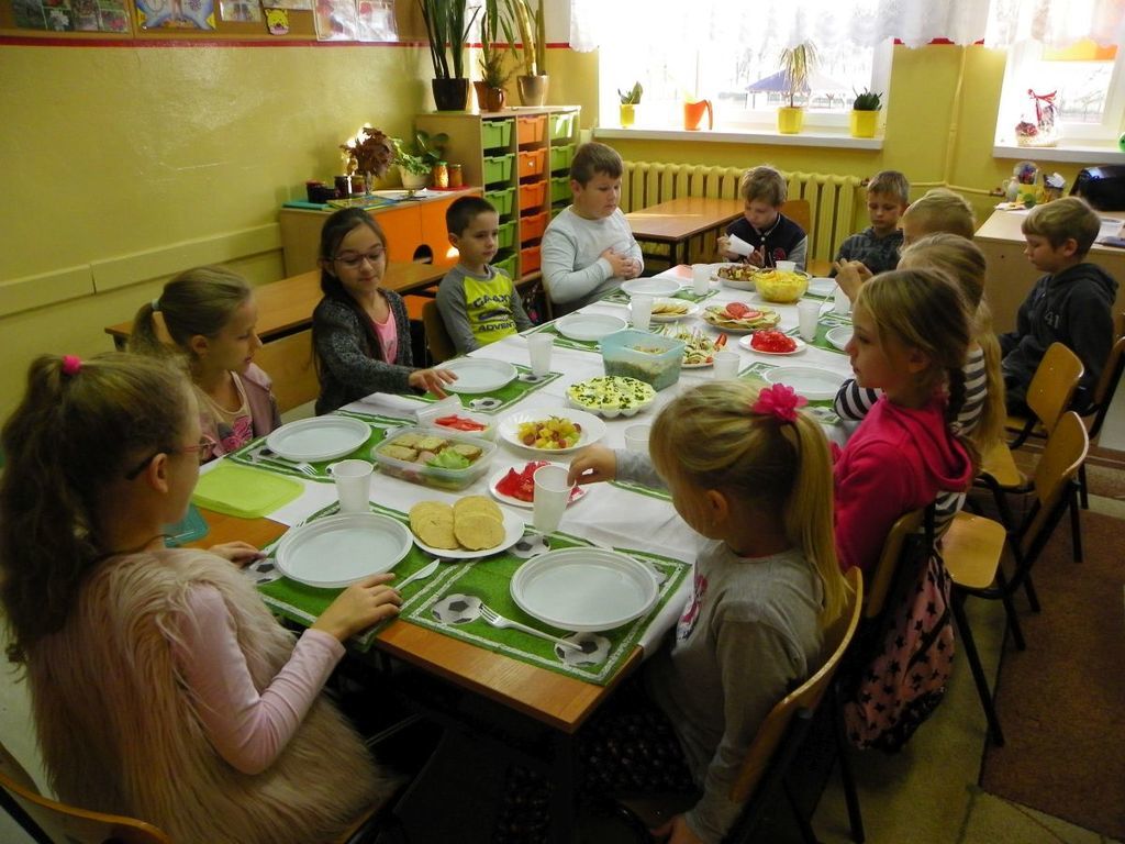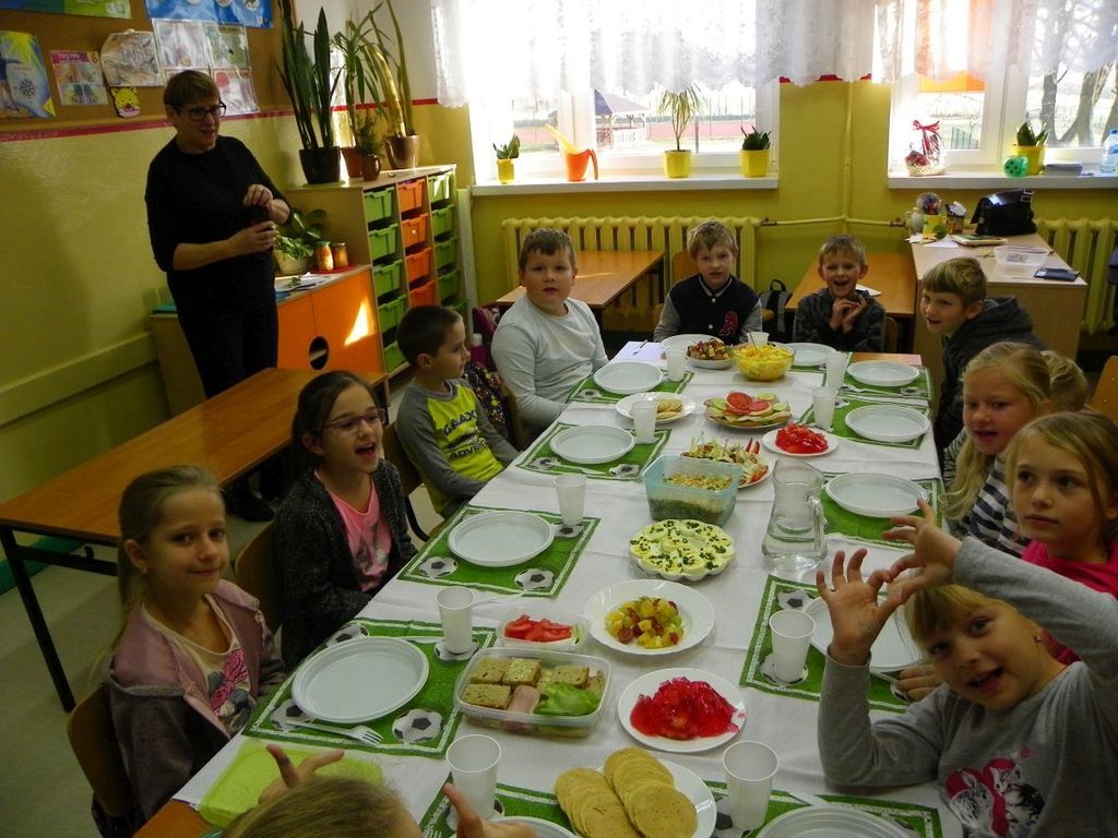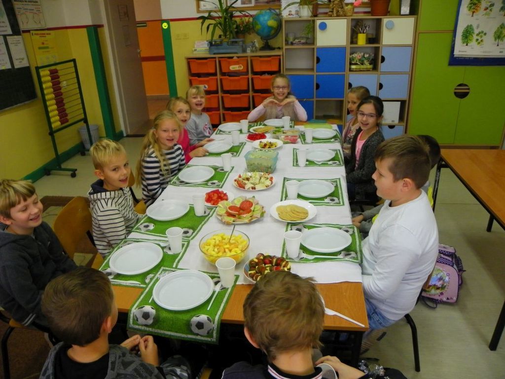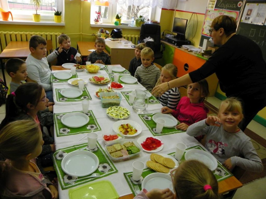 „Śniadanie Daje Moc”, to akcja do której nasza szkoła przystąpiła po raz kolejny. Głównym jej celem jest edukacja najmłodszych oraz zaangażowanie rodziców i nauczycieli w kwestie prawidłowego żywienia dzieci. Akcja została przeprowadzona 8 listopada, a polegała na zorganizowaniu w klasie wspólnego śniadania, wzięły w niej udział klasy 0-III oraz IV-VIII. Najmłodsi uczniowie z każdej klasy wraz z rodzicami i wychowawcami przygotowali kolorowe, owocowe: szaszłyki, sałatki, koreczki, nie zabrakło również zdrowych kanapek, warzywnych sałatek i innych przekąsek takich jak galaretka z owocami. Uczniowie klas IV-VIII sami poradzili sobie z tym wyzwaniem, samodzielnie przygotowując zdrowe posiłki. Wszelkie działania praktyczne poprzedzone zostały omówieniem produktów spożywczych, które korzystnie wpływają na nasze zdrowie. Podczas spożywania wspólnego śniadania, w każdej klasie, zwracano uwagę nie tylko na wartości odżywcze, ale i na kulturę jedzenia.