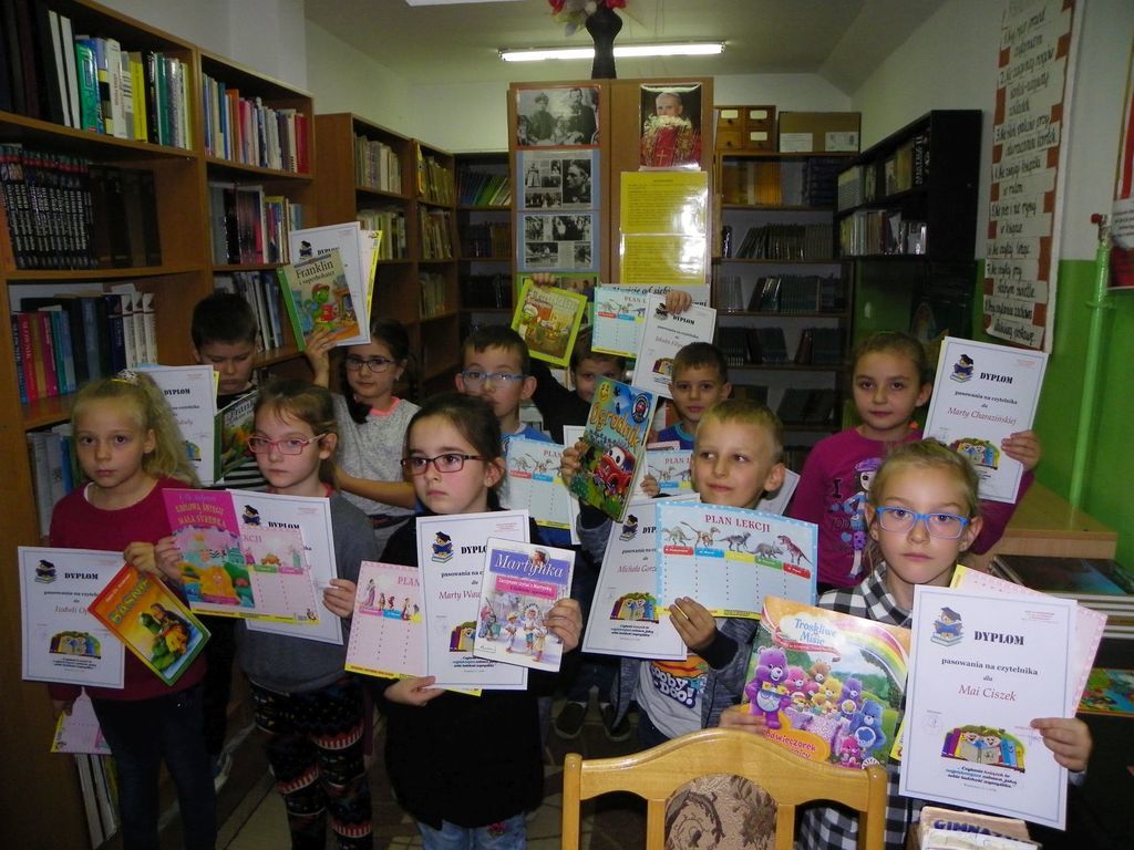 22 listopada 2018 r. odbyło się uroczyste pasowanie na czytelnika biblioteki szkolnej uczniów klasy pierwszej, którzy na tę uroczystość przybyli do biblioteki wspólnie z wychowawczynią Panią Joanną Staciwą. Ta ceremonia to oficjalne przyjęcie uczniów do grona czytelników biblioteki. Zanim jednak uczniowie złożyli przyrzeczenie, wspólnie odczytali „Prośby książki". Pani bibliotekarka opowiedziała przyszłym czytelnikom o księgozbiorze bibliotecznym znajdującym się w bibliotece oraz wskazała półki z literaturą przeznaczoną szczególnie dla nich. Po takim wprowadzeniu nowi czytelnicy złożyli uroczyste przyrzeczenie, że będą chętnie czytać i szanować książki. Następnie pierwszaki otrzymały pamiątkowe dyplomy, zakładki do książek i po raz pierwszy samodzielnie wypożyczyły pierwszą książeczkę. Na zakończenie bibliotekarka zapoznała uczniów z zasadami korzystania z biblioteki szkolnej.