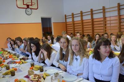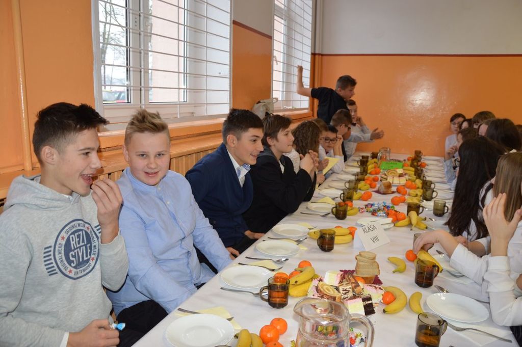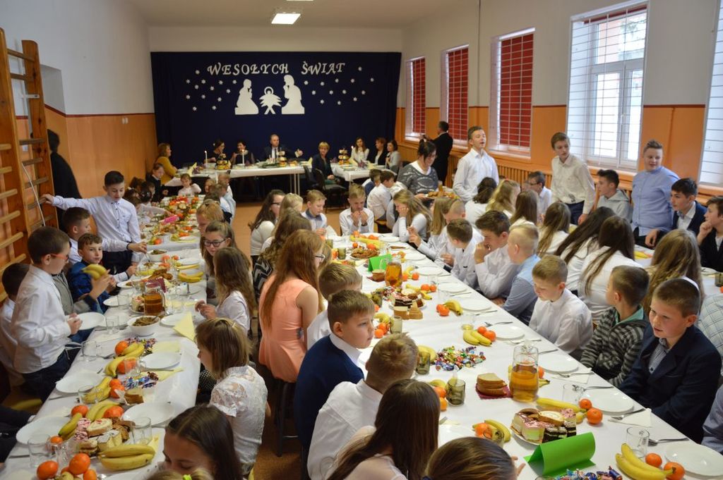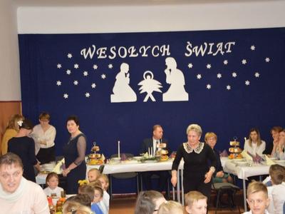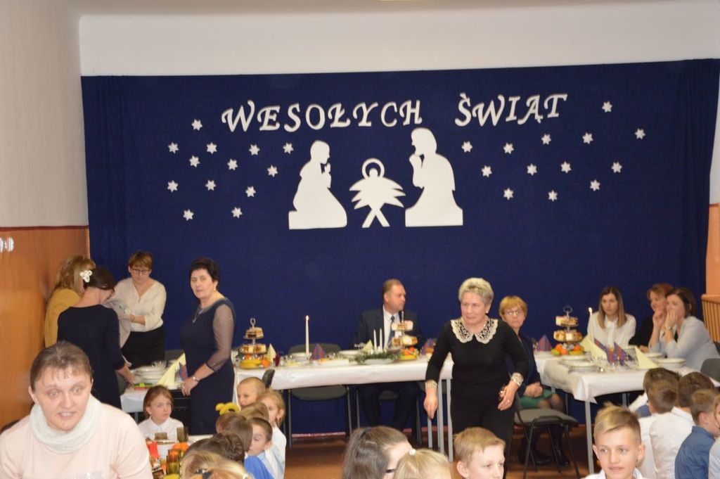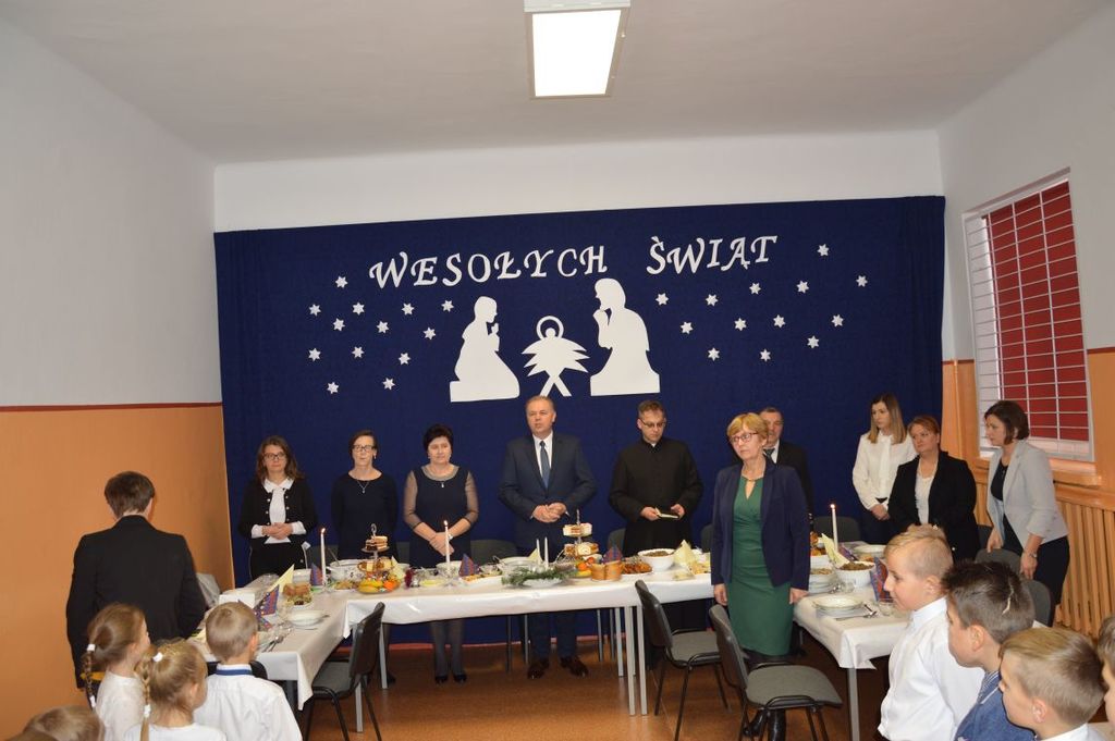 Po obejrzeniu jasełek nauczyciele i uczniowie udali się na wspólną wieczerzę wigilijną. Wszystkim zgromadzonym przy stołach życzenia złożył dyrektor Zbigniew Kowalczyk. Następnie ks. Proboszcz Przemysław Ilnicki odczytał fragment Pisma Świętego, a składając życzenia nawiązał do słów jednej z najpiękniejszych kolęd polskich „Bóg się rodzi” Franciszka Karpińskiego, aby przeżywane Boże Narodzenie umocniło wiarę, nadzieję i miłość w naszym życiu, relacji do Boga oraz bliźniego, a czas świąt Narodzenia Pańskiego był czasem pełnym pokoju i błogosławieństwa spędzonym w rodzinnej atmosferze.