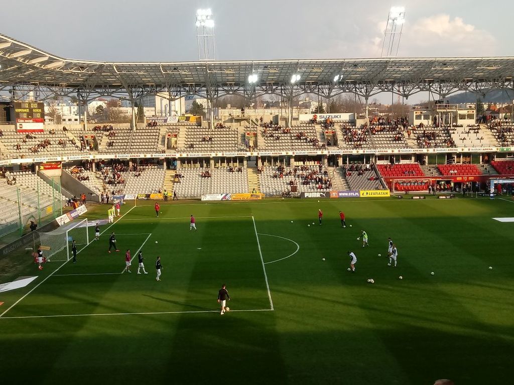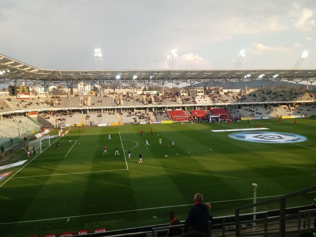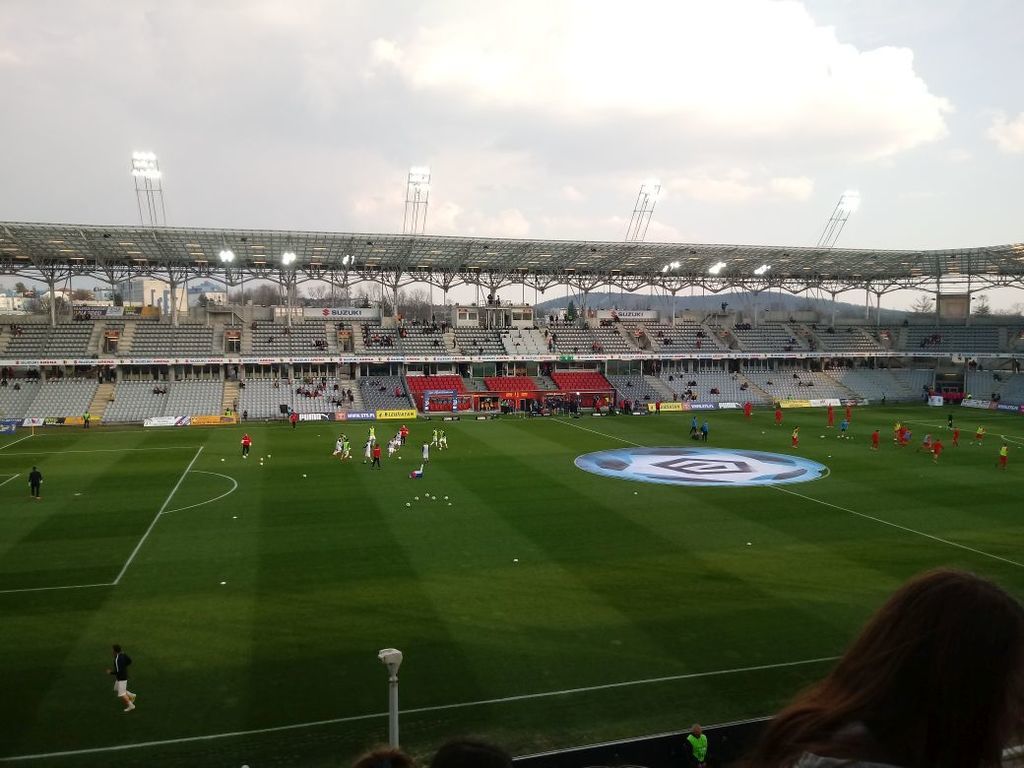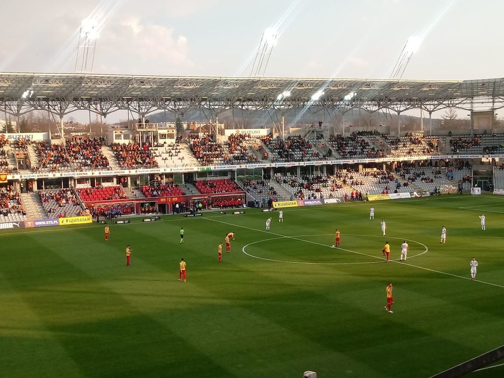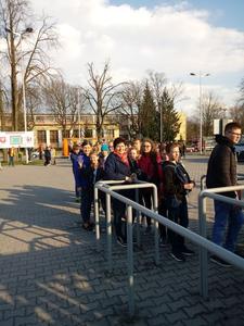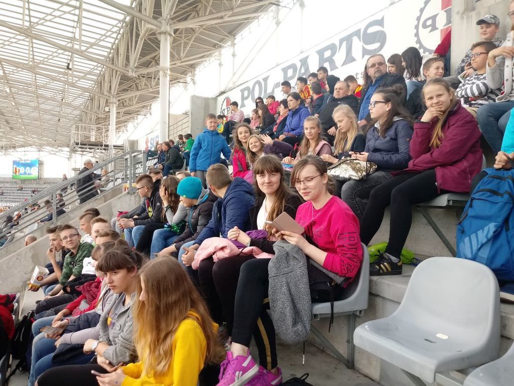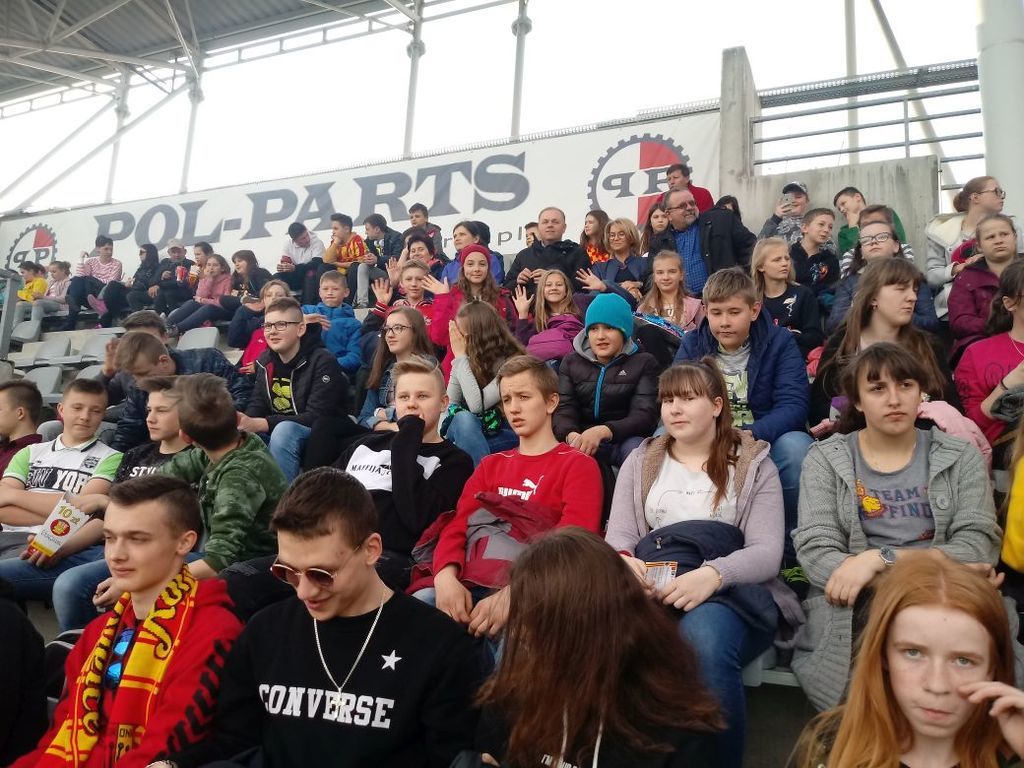 Wejście na stadion odbyło się godzinę przed rozpoczęciem meczu. Uczniowie osobiście poznali procedury związane z bezpieczeństwem na stadionie, między innymi dotyczące tego, co można wnosić na mecz, a co trzeba pozostawić w depozycie. Po wejściu na trybuny wszyscy zajęli miejsca w sektorze B5G i obserwowali rozgrzewkę piłkarzy oraz innych kibiców, którzy zapełniali stadion. Ogólnie wrażenia uczniów były bardzo pozytywne. Wielkim zainteresowaniem cieszyły się oprawy, jakie stworzyli kibice zasiadający na trybunach stadionu podczas meczu. Mecz rozpoczął się punktualnie o godz. 18:00. Podczas całego meczu był prowadzony bardzo żywiołowy doping, w którym nasi uczniowie dzielnie dopingowali zawodników Korony Kielce i świetnie się przy tym bawili. Pomimo niesamowitego dopingu kibiców oraz wiary w końcowy sukces Korony Kielce, niestety gospodarzom nie udało się wyrównać. Korona Kielce przegrała 2:0. Mecz dostarczył wielu emocji.