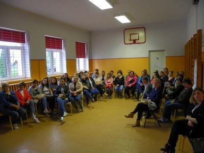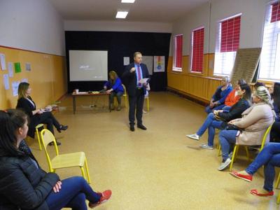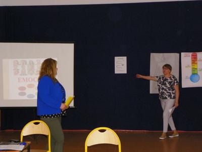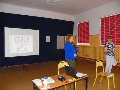 Spotkanie rozpoczęło się od zawarcia kontraktu z grupą rodziców. Następnie każdy rodzic miał za zadanie określić nastrój, w jakim się dziś znajduje: szczęście, strach, smutek, złość, spokój, radość; przyklejając kolorową karteczkę w odpowiednim miejscu. Następnie uczucia zostały pogrupowane na przyjemne i nieprzyjemne, które w znaczny sposób oddziałują na naszą psychikę i reakcję naszego organizmu na otaczający świat. Dzięki temu rodzice dowiedzieli się, że nie ma uczuć dobrych i złych, a dobry bądź zły może być jedynie sposób ich wyrażania lub radzenia sobie z nimi. Rodzice podzieleni zostali na grupy. Przedstawiciel każdej grupy miał za zadanie za pomocą gestów i mimiki wyrazić wylosowaną emocję. W dalszej części spotkania rodzice zobaczyli zadanie, jakie wykonały ich dzieci, dokonując klasyfikacji uczuć przyjemnych i nieprzyjemnych. Uczniowie zaznaczyli na planszy kolorem czerwonym uczucia nieprzyjemne, a niebieskim uczucia przyjemne. Niektóre zostały zaznaczone podwójnym kolorem, co świadczyło, że zaliczają się zarówno do przyjemnych jak i nieprzyjemnych. Następnie rodzice obejrzeli projekcję filmiku Ciasteczko, po której omówione zostały zachowania bohaterów filmu. Rodzice na podstawie doświadczenia z balonem mogli zobaczyć, co może stać się ze złością. Doszliśmy do wspólnych wniosków, że można ją wypuścić jak powietrze z balonu lub tłumić w sobie, aż w końcu pęknie jak balon lub wybuchnie jak wulkan. Skala złości porównana została do góry lodowej, gdzie miarą nasycenia był kolor czerwony, a co za tym idzie wybuch złości. Kolejne zadanie, jakie czekało uczestników spotkania, to określenie, gdzie u człowieka kumuluje się złość. Rodzice bardzo podobnie do swoich pociech, wybrali głowę i żołądek. Omówiono również sposoby radzenia sobie ze złością.