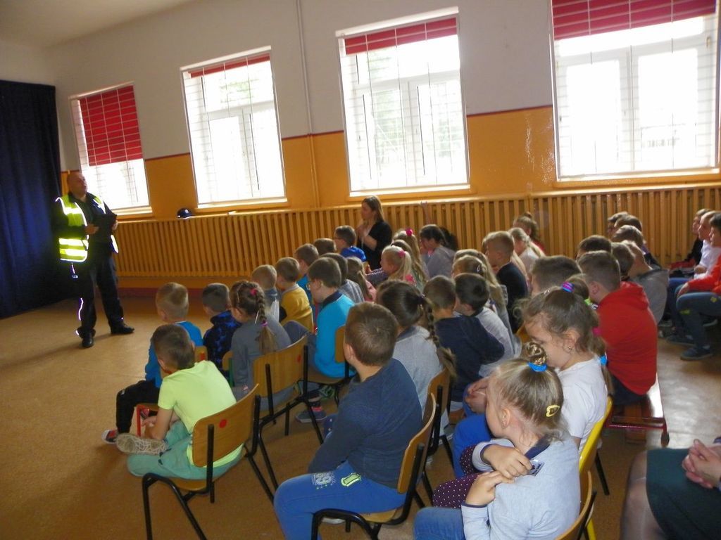 W ramach Szkolnych Dni Profilaktyki 14 maja 2019 roku uczniowie klas 0-IV uczestniczyli w spotkaniu z dzielnicowym panem Sławomirem Marchewką. Dzieci miały okazję porozmawiać z policjantem o bezpieczeństwie w związku ze zbliżającymi się wakacjami. Funkcjonariusz przypomniał zasady poruszania się po ulicy, chodniku i podczas jazdy rowerem, nadmienił, żeby zachować szczególną ostrożność nad wodą i w górach oraz aby nikomu nieznajomemu nie otwierać drzwi. Gość zwrócił uwagę na niebezpieczeństwa, jakie mogą czyhać na dzieci w kontaktach z obcymi, przedstawił sposoby unikania ich. Ponadto podkreślił, jak ważną rolę pełnią elementy odblaskowe, które każdy powinien posiadać. Druga ważna sprawa, jaką funkcjonariusz omówił z uczniami, to zagrożenia i ewentualne skutki prawne będące wynikiem niewłaściwego korzystania z internetu, telefonów komórkowych.