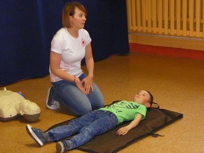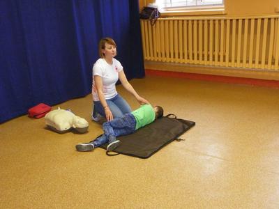 Ratowniczka pokazała uczniom klas 0-VIII, jak ułożyć rannego w pozycji bocznej ustalonej jako pozycji bezpiecznej dla osoby poszkodowanej,