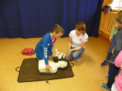 i aktywnie brali udział w wykonywaniu podstawowych czynności ratowniczych pod fachowym okiem ratownika medycznego. Następnie p. Siemieniec zaprezentowała działanie defibrylatora, założenie kołnierza ortopedycznego oraz jak postępowanie w czasie krwotoku czy zadławienia. Na zakończenie spotkania udzielała odpowiedzi na liczne pytania przez naszych uczniów.