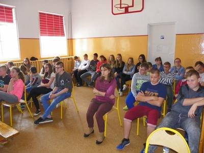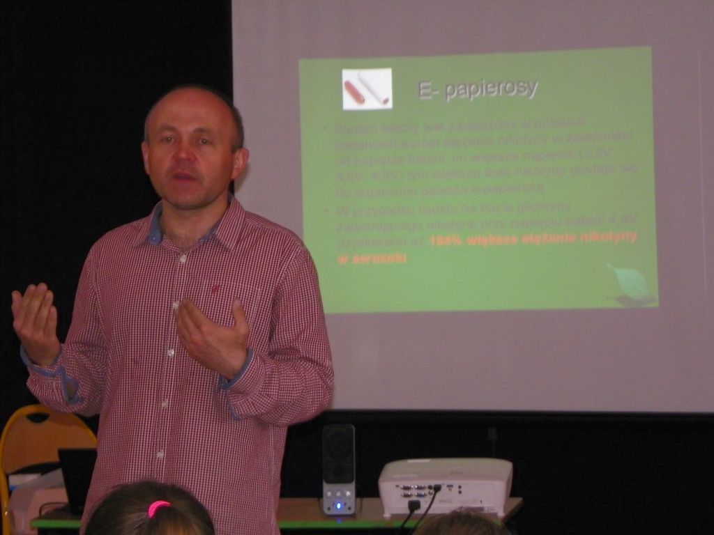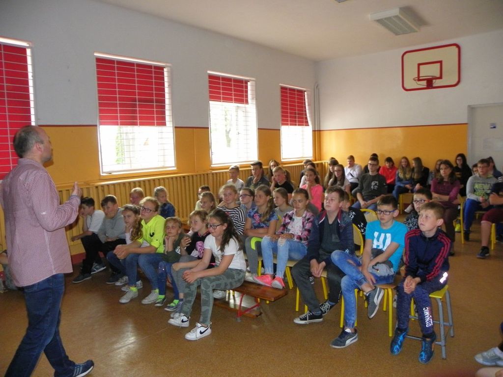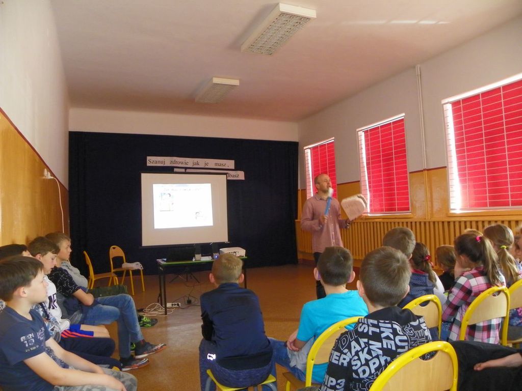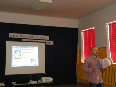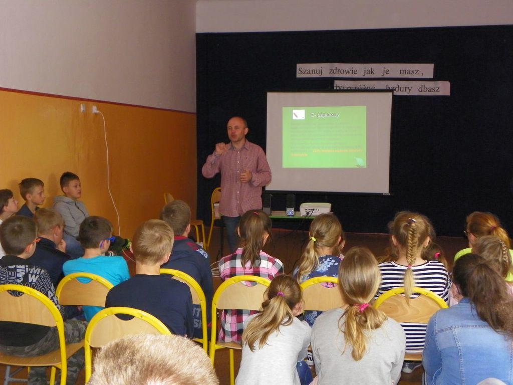 W poniedziałek 20 maja 2019 r. po spotkaniu z klasami młodszymi pan Marcin Szyposzyński - przedstawiciel Powiatowej Stacji Sanitarno - Epidemiologicznej w Końskich spotkał się z uczniami klas V-VIII. W ramach Tygodnia Profilaktyki poprowadził dla nich prelekcję, na której omówione zostały skutki nałogów, zwłaszcza zagrożenia związane z paleniem e - papierosów. Następnie, tak jak w klasach młodszych, zwrócił uwagę na problem nieprzestrzegania higieny wśród ludzi. Na spotkaniu pokazał również prezentację multimedialną oraz krótki film o tym, jakie konsekwencje wynikają z sięgania po takie używki jak: papierosy, alkohol, dopalacze. Następnie przytoczył kilka uwag na temat higieny osobistej -skutków oraz chorób związanych z jej brakiem. Uczniowie w imieniu swoim i młodszych kolegów podziękowali za ciekawą lekcję. Spotkanie zorganizowały panie: Joanna Ściegienna i Anna Majchrzak.