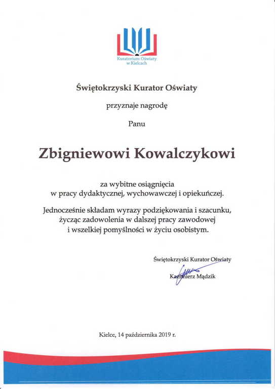 Wśród nagrodzonych był dyrektor naszej szkoły, który odebrał nagrodę Świętokrzyskiego Kuratora Oświaty z rąk Kazimierza