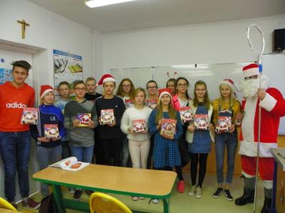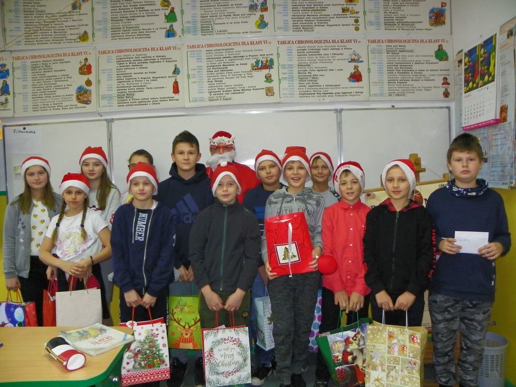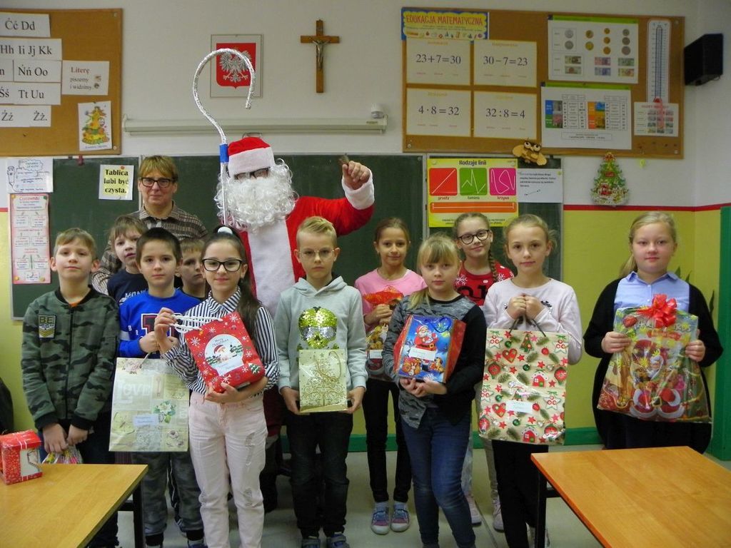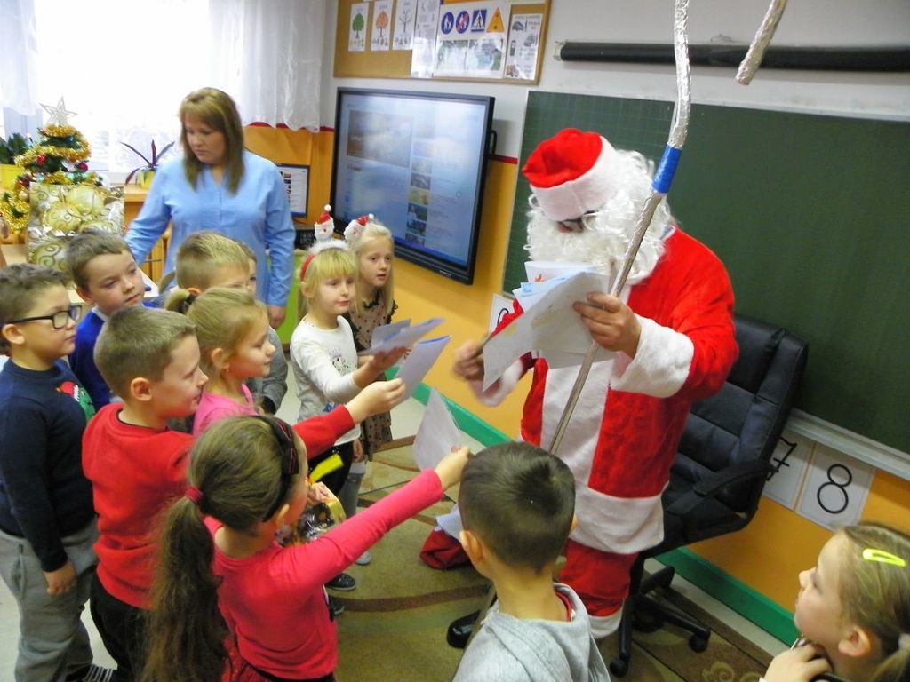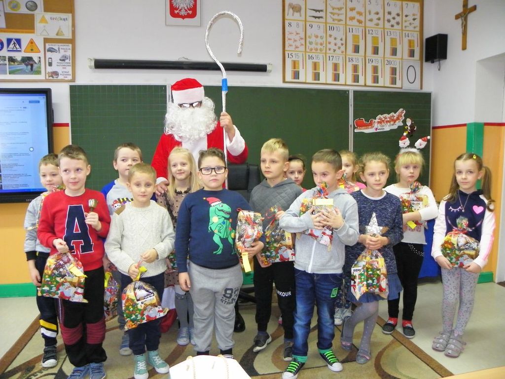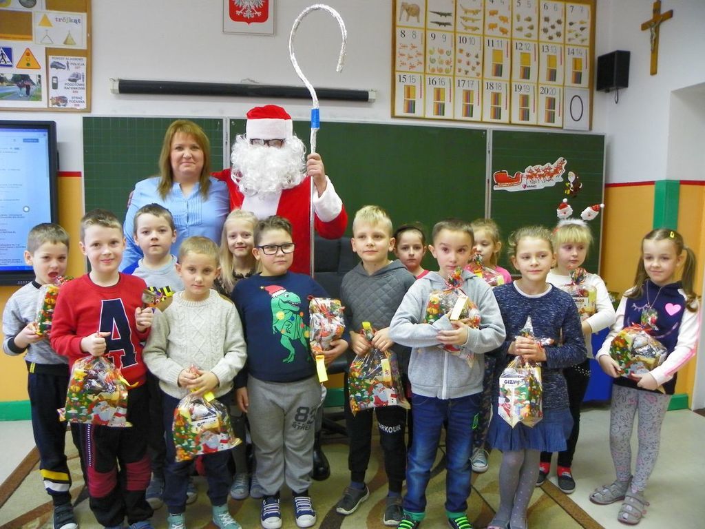 Mikołajki to szczególny dzień, na który z utęsknieniem czekają wszystkie dzieci. Mimo braku białego puchu w dniu 6 grudnia 2019 r. długo wyczekiwany Gość przybył do naszej szkoły, by obdarować grzeczne dzieci upominkami. Miłego gościa dzieci radośnie przywitały piosenkami. Przedszkolaki i uczniowie klas I – III śmiało podchodziły do Mikołaja i odpowiadały na jego pytania, a w zamian otrzymały upragniony prezent, który wywołał radość i uśmiech na ich twarzach. Za otrzymane upominki dzieciaki wręczyły Mikołajowi własnoręcznie przygotowane prace plastyczne przedstawiające wizerunek Mikołaja. Na koniec wizyty każda klasa i oddział przedszkolny zrobił sobie z Mikołajem pamiątkowe zdjęcia i zaprosił go na przyszły rok. Od samego rana z każdej strony biegali po korytarzach uczniowie ubrani na czerwono, w pięknych mikołajkowych czapkach Oczekiwane cały rok mikołajki minęły w bardzo miłej atmosferze i przyniosły naszym podopiecznym wiele radości. Dzień ten na długo pozostanie w pamięci wszystkich uczniów naszej szkoły. Serdecznie dziękujemy Świętemu Mikołajowi za odwiedziny i obdarowanie prezentami przedszkolaków i najmłodszych uczniów naszej szkoły.