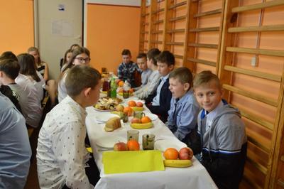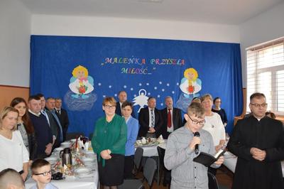 Po występach naszych młodych artystów przyszła kolej na coroczną, wspólną wigilię. Spotkanie tradycyjnie rozpoczęło się od odczytania fragmentu Pisma Św. W tym roku zrobił to nasz uczeń Kamil Mączyński. Następnie ksiądz proboszcz Przemysław Ilnicki skierował słowo do wszystkich zebranych na sali, po czym uczniowie, nauczyciele oraz zaproszeni goście zasiedli do wspólnej wieczerzy poprzedzonej łamaniem się opłatkiem. Serdecznie dziękujemy pani kucharce Marzannie Bieleckiej oraz paniom Agnieszce Maciążek i Annie Szustak za trud włożony w przygotowanie potraw. Wigilia szkolna wprawiła nas w miły, rodzinny i świąteczny klimat Bożego Narodzenia.