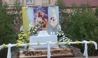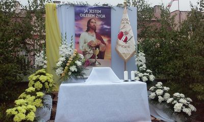 Nasz skromny udział w tej uroczystości podkreślała również obecność Sztandaru Szkoły Podstawowej im. św. Jana Pawła II w Wilczkowicach, który został wystawiony przy ołtarzu wzniesionym na tle budynku szkoły. W ten sposób oddaliśmy hołd Ciału i Krwi Chrystusa.