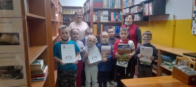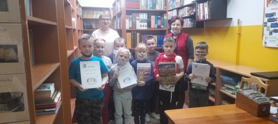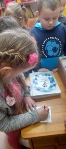 Pierwszoklasiści odgadywali także bajkowe zagadki, które sprawdziły ich znajomość bohaterów baśni i bajek. Po takim wprowadzeniu przyszli czytelnicy złożyli uroczyste przyrzeczenie, że zawsze będą szanować książki, a pani bibliotekarka Wiesława Zbróg dokonała pasowania każdego z uczniów. Na pamiątkę uczniowie otrzymali dyplomy, które będą im przypominały o tym uroczystym wydarzeniu. I wreszcie przyszedł czas na wypożyczenie pierwszej książeczki. Na pewno w tym momencie radość nowych czytelników była największa. Cała klasa wypożyczyła Zaczarowaną zagrodę i dodatkowo wybraną przez siebie książkę.