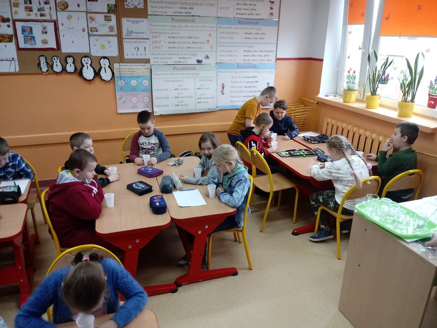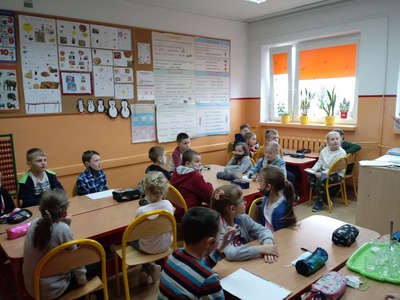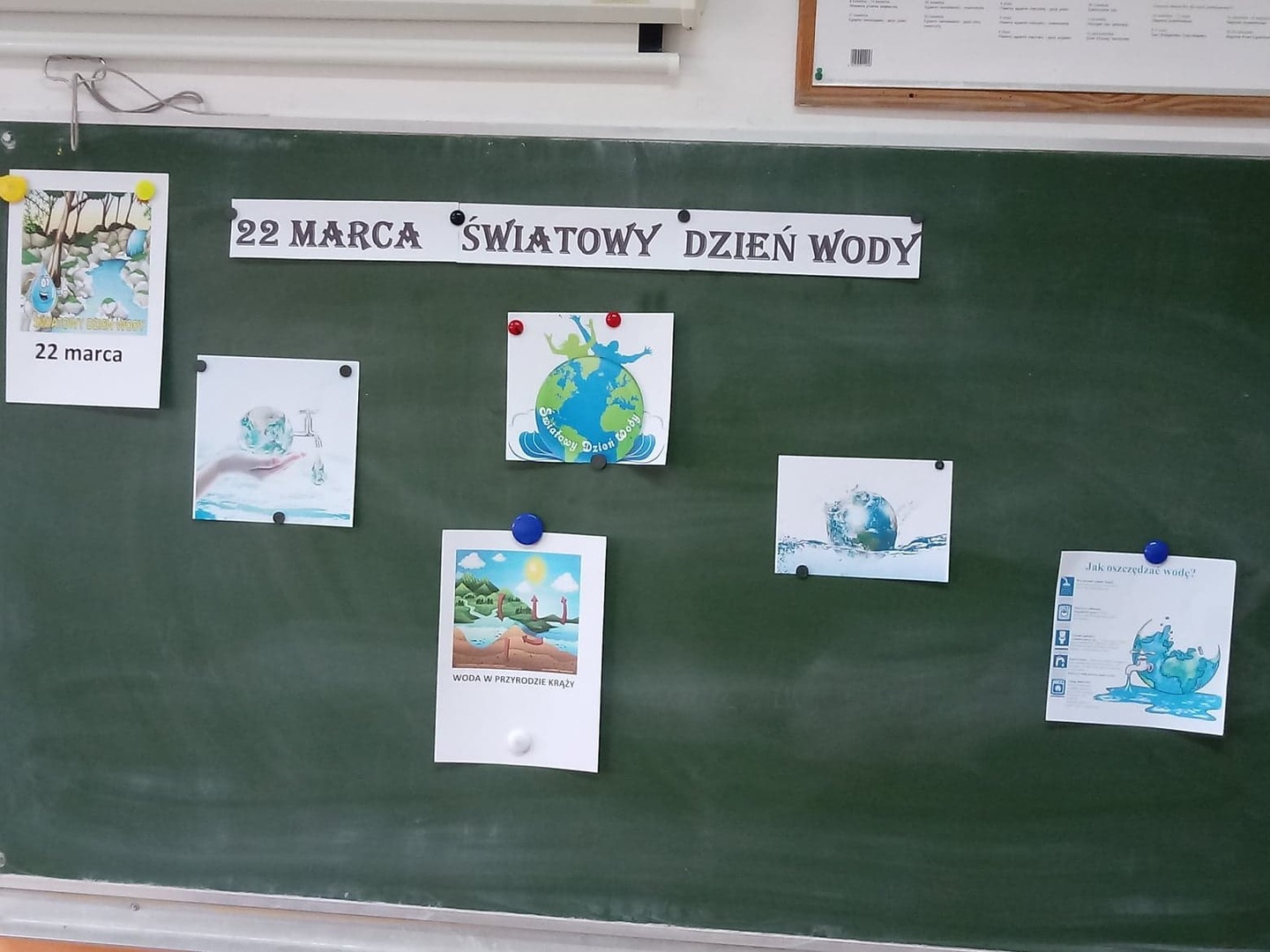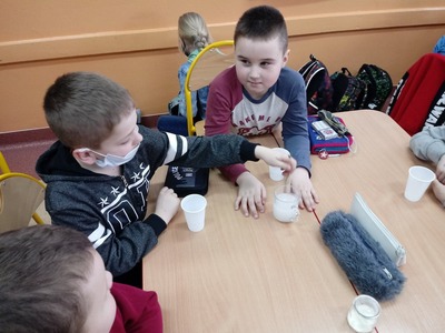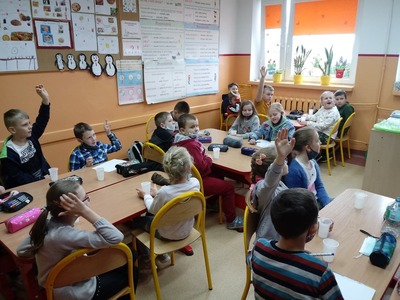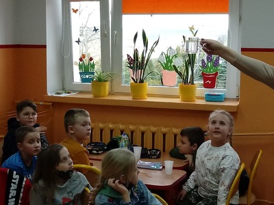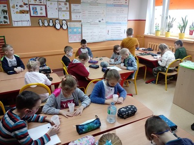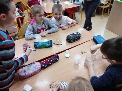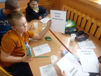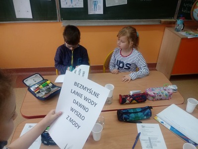 Z okazji Światowego Dnia Wody uczniowie klasy pierwszej i drugiej wzięli udział w zajęciach edukacyjnych prowadzonych przez Panią Alinę Dymińską i Panią Joannę Ściegienną, które swą wiedzą, przygotowanymi ciekawymi materiałami oraz prezentacją multimedialną wprowadziły uczniów w tematykę wody. Podczas zajęć uczniowie dowiedzieli się, a także poszerzyli swą wiedzę na bardzo ważny dla wszystkich temat: co to jest woda, jakie są jej właściwości, w jakich stanach występuje, jak wygląda jej obieg w przyrodzie, jaki jest jej podział, problem dostępności wody, zanieczyszczeń wód, oczyszczania i ochrony wód; a także szukanie odpowiedzi na pytanie, co my możemy zrobić, aby oszczędzać wodę. Uczniów zainteresowały wiadomości związane z wpływem picia wody na organizm człowieka. Dowiedzieli się, że ciało ludzkie w 70% zawiera wodę i jej picie ma wpływ na koncentrację. Podczas zdobywania informacji pomogło uczniom kosztowanie wody, którą każdy uczeń miał w swoim kubeczku. Następnie pod okiem nauczycielek uczniowie podzieleni na cztery grupy wykonywali różne doświadczenia z wodą, do której dodawali różne przedmioty między innymi: cukier, mąkę, sól, olej, plastik, gałązki, papier, kamyki.