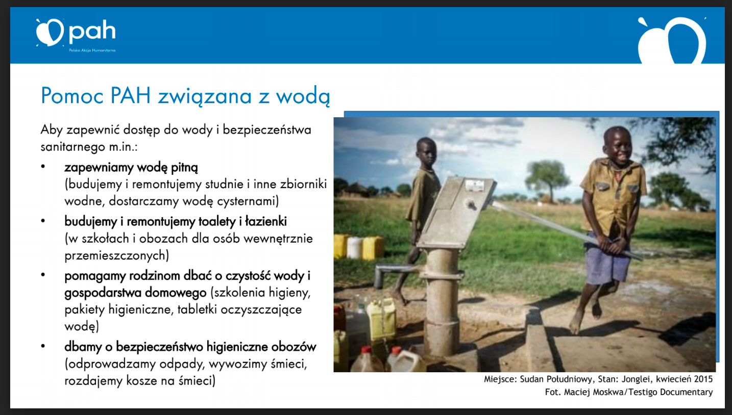 Dzieci z dużym zainteresowaniem oglądały serie filmików np. „Jak wygląda pomoc w praktyce - Naprawa sieci kanalizacyjnej w Jemenie” , „Woda jest dla mnie wszystkim", animację: „Oszczędzanie wody to za mało”. Dla nas mieszkańców Europy perspektywa codziennego pokonywania 5 km w celu zdobycia wody wydaje się abstrakcyjna i odległa. Dane i statystyki, które czytamy na temat braku dostępu do wody, to dla nas jedynie „suche fakty”. Tymczasem świat bez wody to już rzeczywistość setek milionów ludzi m.in. mieszkających w Somalii i Sudanie Południowym.