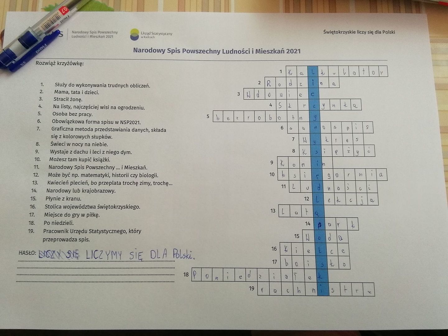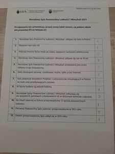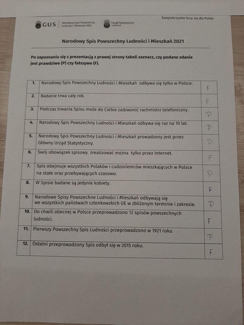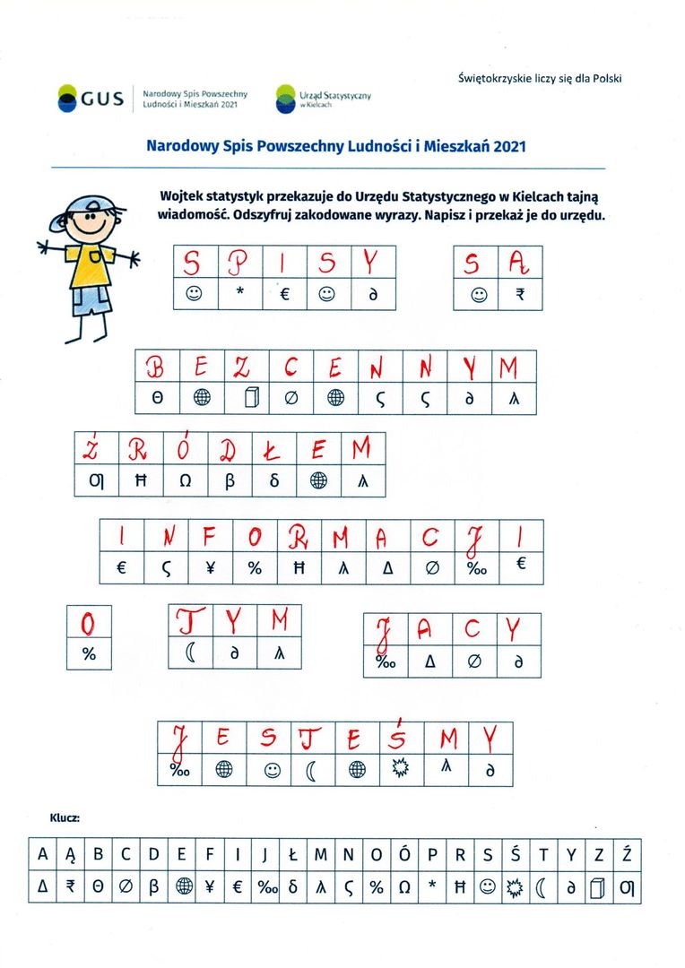 Zadaniem uczniów klasy II było rozszyfrowanie tajnej wiadomości, którą Wojtek statystyk miał przekazać do Urzędu Statystycznego w Kielcach. Rozszyfrowana wiadomość brzmiała następująco: „SPISY SĄ BEZCENNYM ŹRÓDŁEM INFORMACJI O TYM, JACY JESTEŚMY”. Zadaniem uczniów klasy IV było na podstawie zdobytych informacji odpowiedzieć na pytania zawarte w krzyżówce i rozwiązanie hasła. Hasło ukryte w krzyżówce brzmiało: „LICZYMY SIĘ DLA POLSKI”. Uczniowie klasy VII po zapoznaniu się z prezentacją mieli za zadanie zaznaczyć czy podane zdanie jest prawdziwe czy fałszywe.
