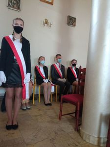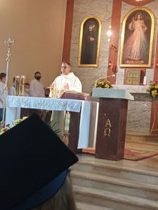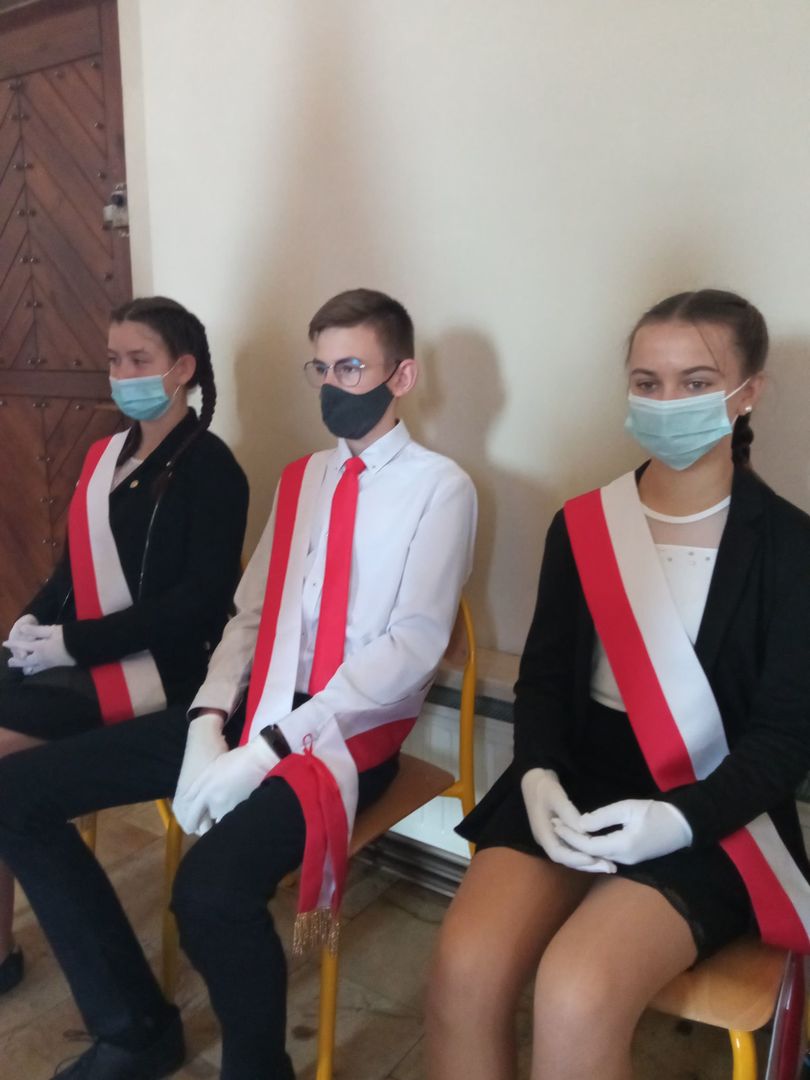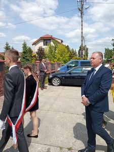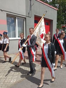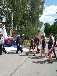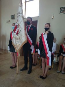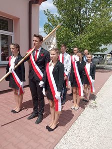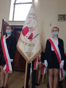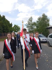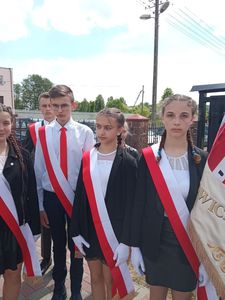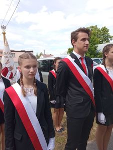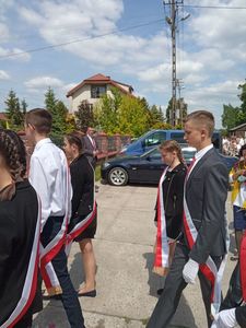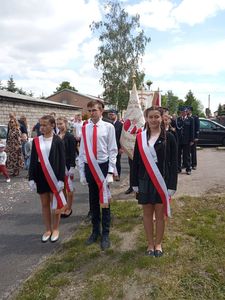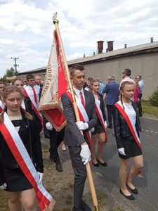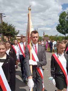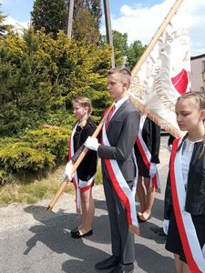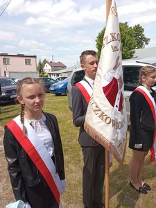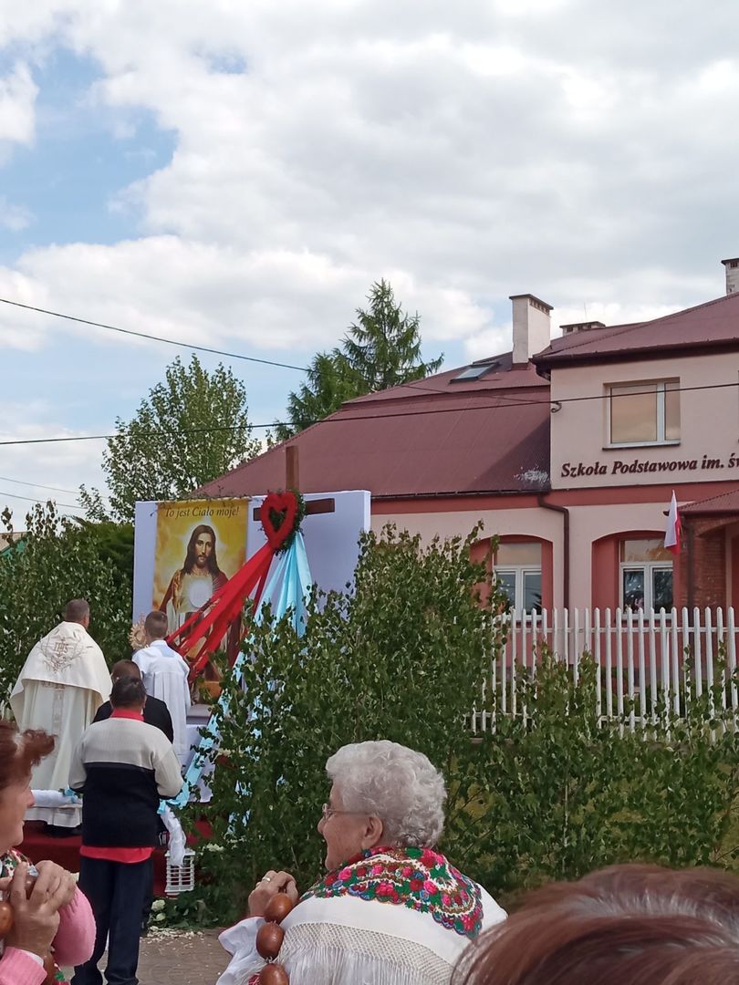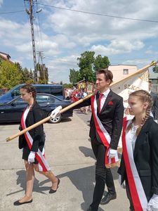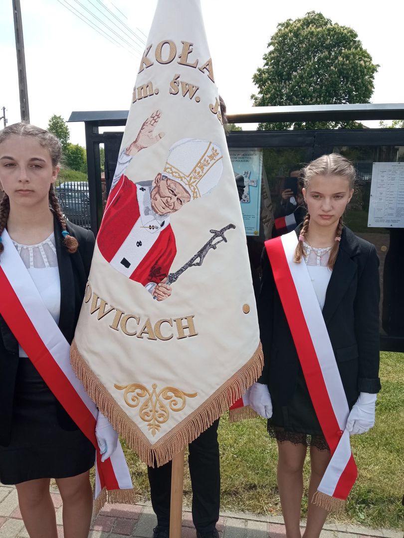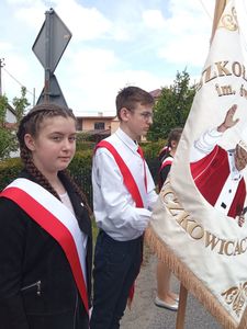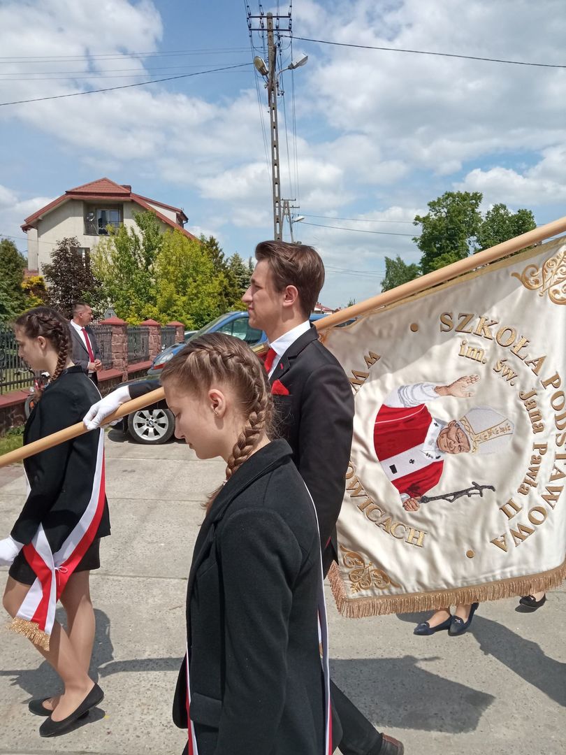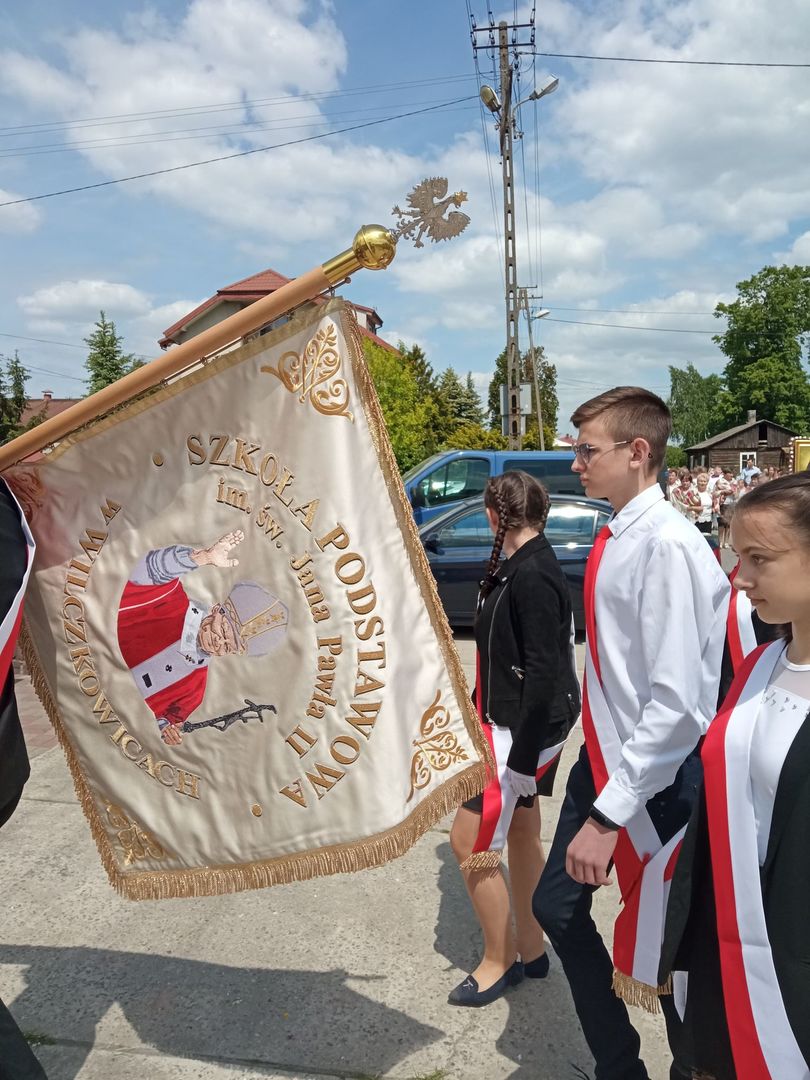POCZET SZTANDAROWY Szkoły Podstawowej im. św. Jana Pawła II w Wilczkowicach w składzie: Elżbieta Kotras, Konrad Usnarski, Klaudia Mazur, Aleksandra Ciszek, Kacper Basiak, Magdalena Szustak, Paulina Dębska, Adam Szustak, Natalia Mazur uczestniczył w Uroczystościach Najświętszego Ciała i Krwi Chrystusa, zwanego potocznie Bożym Ciałem, które odbyły się 03. 06. 2021 roku. Z tej okazji, zgodnie z tradycją, przeszła procesja do specjalnie zbudowanych na ten cel czterech ołtarzy. Mszy Świętej przewodniczył Proboszcz Parafii w Wilczkowicach - ks. Przemysław Ilnicki.