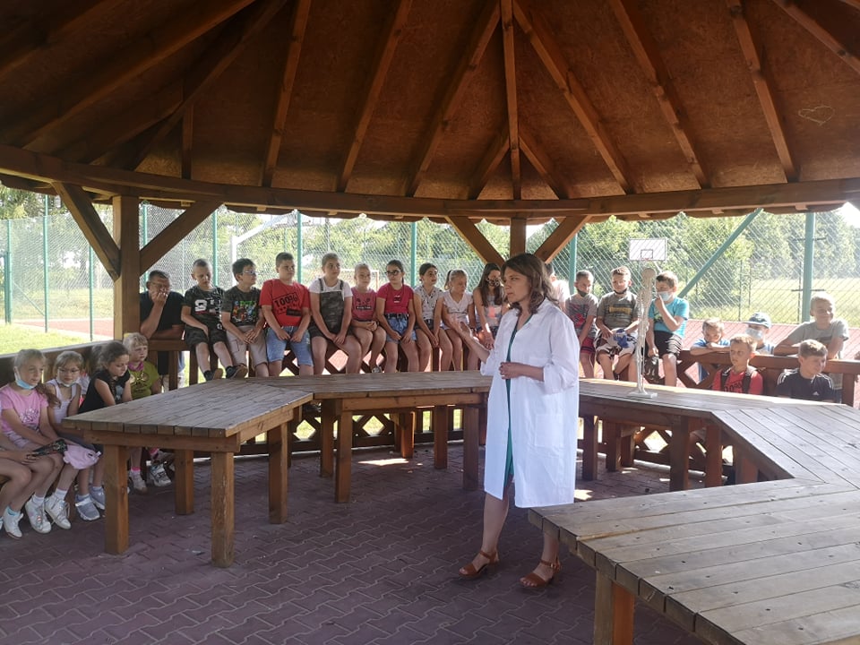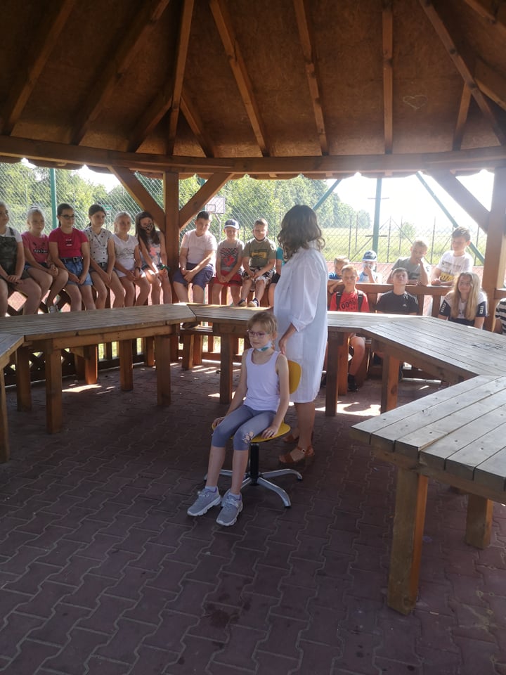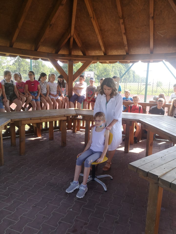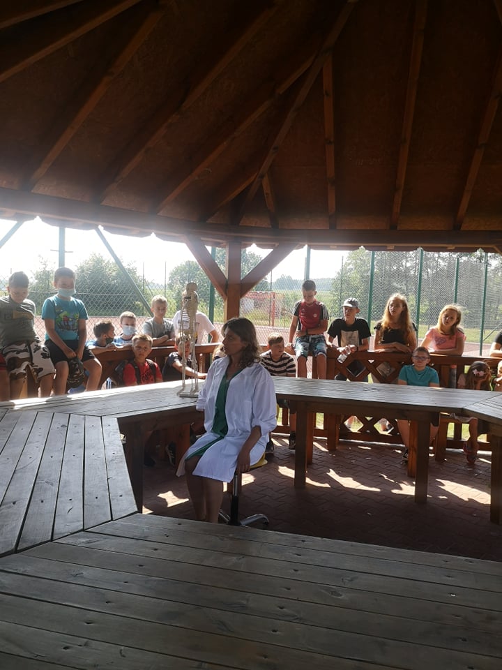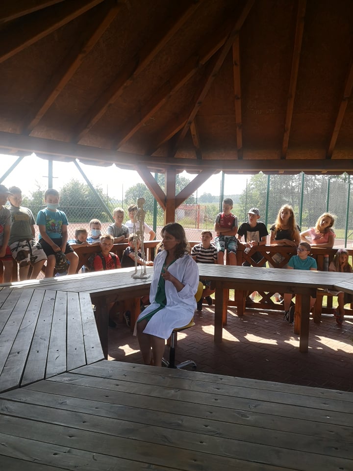 W dniu 17 czerwca 2021 roku uczniowie naszej szkoły uczestniczyli w spotkaniu z fizjoterapeutką, p. Anną Kasprzyk. Miało ono postać warsztatów pt.”Zdrowy kręgosłup”. Dzięki przeprowadzonym warsztatom, dzieci pozyskały praktyczną wiedzę odnośnie utrzymywania prawidłowej postawy ciała w siedzeniu, co w dobie nauki zdalnej jest ogromnie ważnym czynnikiem. Fizjoterapeutka zaznaczyła, że na wykształcenie się prawidłowej postawy ciała wpływają trzy istotne kwestie. Pierwszą z nich jest rozwój mięśni posturalnych wokół kręgosłupa (odpowiedzialnych za utrzymanie kręgosłupa we właściwym kształcie). Drugą istotną kwestią jest właściwa edukacja i profilaktyka w zakresie utrzymania prawidłowej postawy ciała w trakcie czynności dnia codziennego, takich jak siedzenie, stanie, chodzenie czy bieganie. Trzecim istotnym czynnikiem w procesie rozwoju dzieci jest jak największa ilość ruchu. Aktywne spędzanie czasu z rówieśnikami może zniwelować negatywne skutki statycznego obciążenie kręgosłupa, charakterystycznego dla siedzącego trybu życia. Fizjoterapeutka podkreśliła, że dzieci starają się przeciwdziałać pozostawaniu w długotrwałym bezruchu, dlatego podczas lekcji w szkole, nauki zdalnej, odrabiania prac domowych lub w trakcie innych, „statycznych” czynności rekompensują sobie siedzącą pozycję różnymi delikatnymi ruchami ciała (np. pochylaniem się czy kołysaniem). W pewnych sytuacjach ta naturalna ochrona zostaje jednak „wyłączona”. Dzieje się to wtedy, gdy dzieci skupiają się np. na tym, co wyświetla się na ekranie telewizora lub komputera. Pozostanie w bezruchu przez 5 czy 10 minut prowadzi do napięcia mięśni, a w efekcie – późniejszego bólu kręgosłupa.