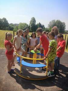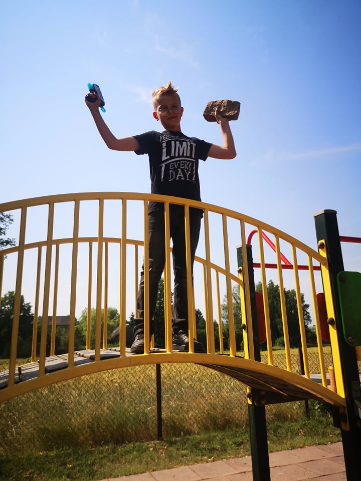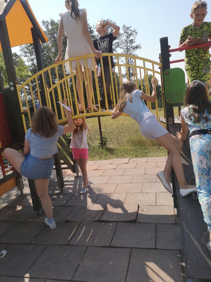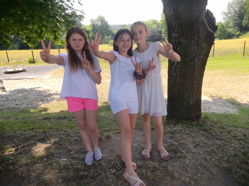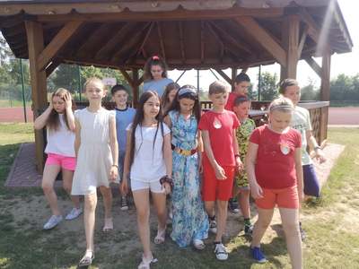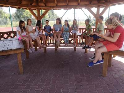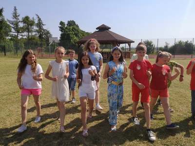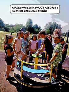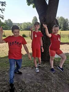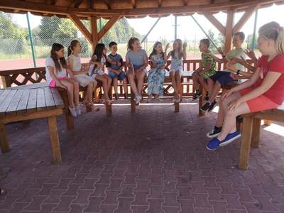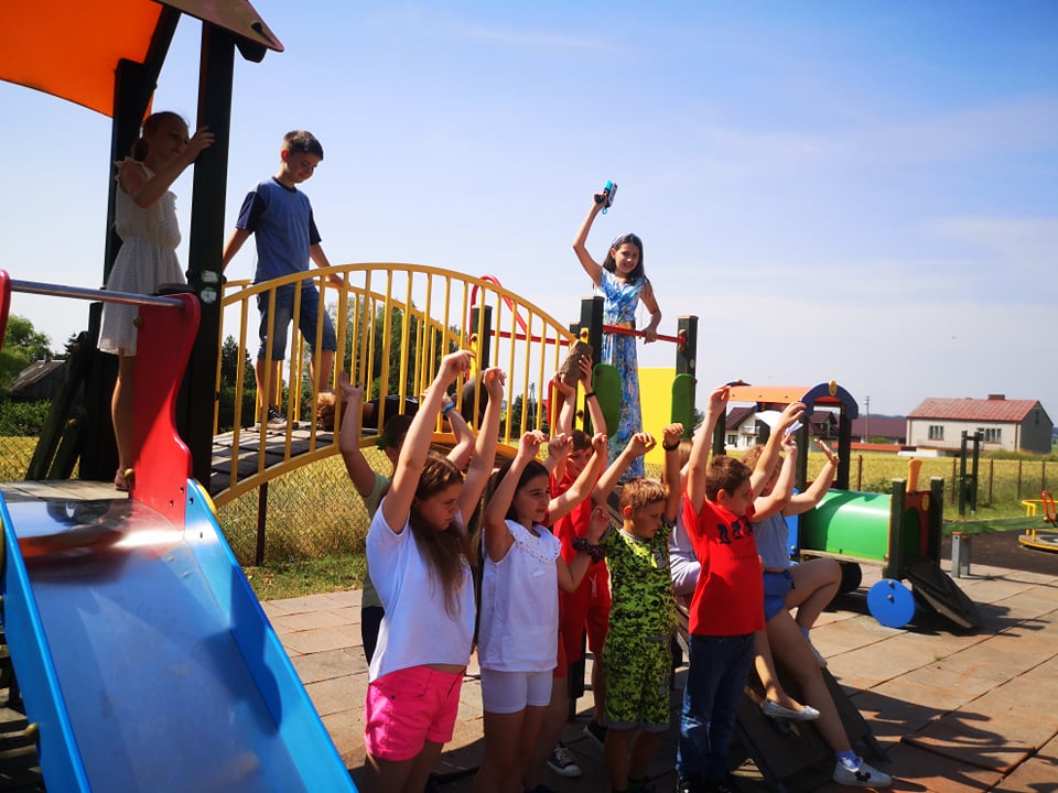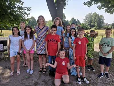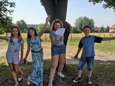 W dniu 22 czerwca 2021 roku uczniowie klasy IV pod kierunkiem nauczycielki języka polskiego p. Małgorzaty Basiak-Przyjemskiej uczestniczyli w ciekawej lekcji w terenie, której celem było przygotowanie materiału do wykonania komiksu. Uczniowie wspólnie z polonistką opracowali scenariusz komiksu pod tytułem "Cztery Żywioły i Magiczny Kamień". Fabuła opiera się na odwiecznym konfikcie dobra ze złem. 4 żywioły z łacińskimi imionami: Ignis (ogień), Ventus (wiatr), Terrus (ziemia) oraz Auqa (woda) walczą z Chaosem o Magiczny Kamień, który ma przywrócić równowagę i pokój na świecie. Dlatego wyruszają ze swoimi drużynami do Grodu Ciemności. Każda drużyna reprezetuje inny żywioł, co zaakcentowano odpowiednimi kolorami strojów: czerwony dla ognia, zielony dla ziemi, biały dla wiatru i niebieski dla wody. Nie będziemy zdradzać całej fabuły, jedynie jej zarys, ponieważ gotowy komiks po opracowaniu zostanie zamieszczony na stronie szkoły oraz wydrukowany w wersji papierowej.