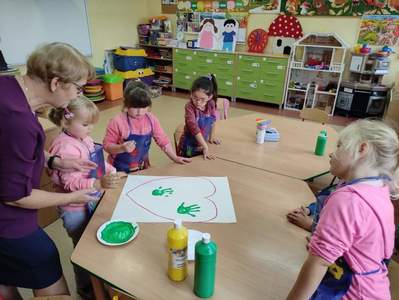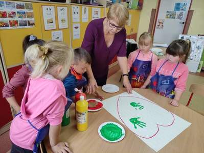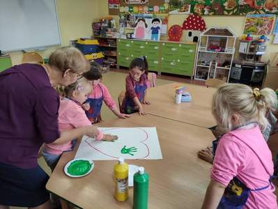 Dzieci wysłuchały nagrania piosenki „Dzień przedszkolaka” w wyk. D. Błażejczyk i M. Urbaniaka, następnie chętnie ją śpiewały. Cieszyły się z girlandy w sali przedszkolnej, wesołych zdjęć w ramce foto-budce. Zapamiętały rymowanki: ”Przedszkolaki to super dzieciaki!”, „Dzień Przedszkolaka to ważna sprawa- czeka nas super zabawa!”. Najwięcej frajdy miały tworząc grupowe serduszko poprzez odbijanie dłoni pomalowanej farbą plakatową w konturze serca. Przedszkolaki podołały wyzwaniu quizu na temat przedszkola i rówieśników, jak również rozpoznawaniu kolegów po głosie. Oczywiście nie zabrakło spontanicznej zabawy balonami, wspólnej pamiątkowej fotografii. Każdy milusiński otrzymał od wychowawczyni p. Joanny Staciwy „Medal Dnia Przedszkolaka 2021”. Dzień ten dostarczył dzieciom udanej zabawy oraz radości z bycia przedszkolakiem.