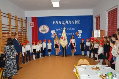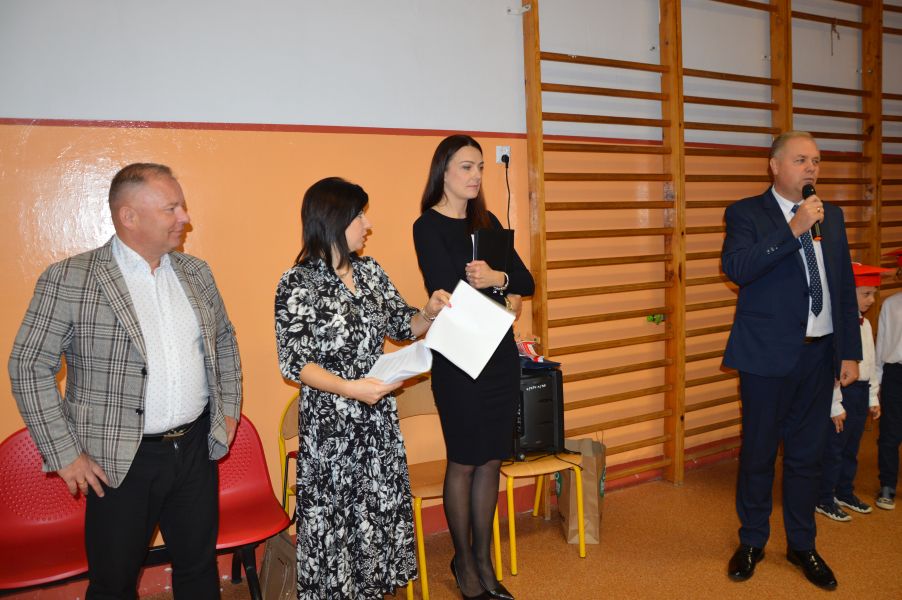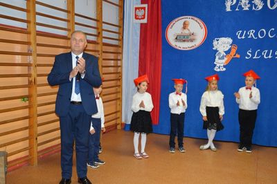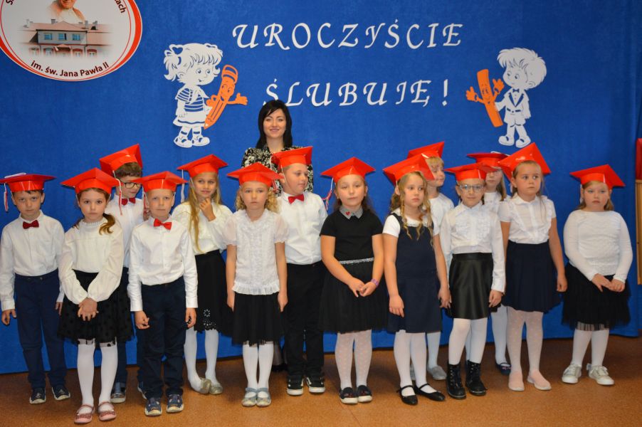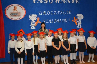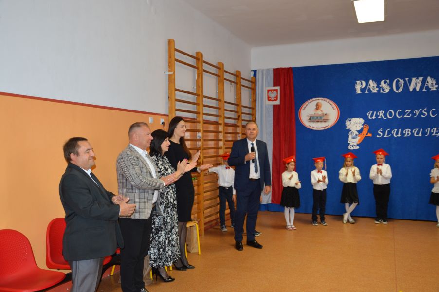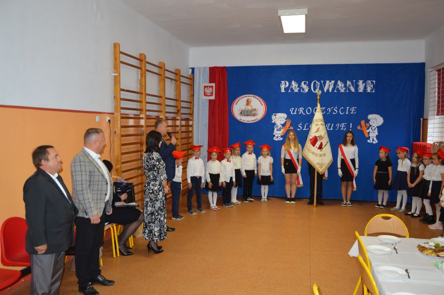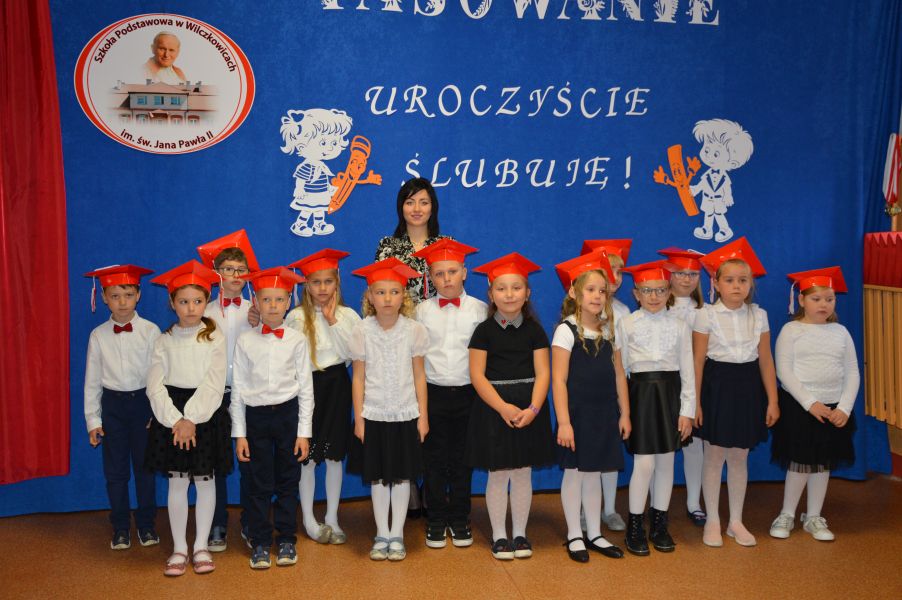 Dnia 13.10.2021 r w Szkole Podstawowej im. św. Jana Pawła II w Wilczkowicach odbyło się ślubowanie uczniów pierwszej klasy. To bardzo ważny dzień dla nich, ponieważ od tego momentu stają się pełnoprawnymi uczniami szkoły. Dyrektor Zbigniew Kowalczyk, rozpoczynając uroczystość, serdecznie powitał przybyłych gości, m.in. Burmistrza Miasta i Gminy Radoszyce Michała Pękalę, Radnego Rady Miejskiej w Radoszycach Jana Kaczmarczyka oraz wszystkich Rodziców. Oficjalnie ślubowanie rozpoczęło się wprowadzeniem sztandaru i wspólnym odśpiewaniem hymnu szkoły. Następnie Pan Dyrektor dokonał aktu pasowania na ucznia poprzez symboliczny gest położenia dużego ołówka na prawym ramieniu każdego dziecka. Zaraz po tym podniosła atmosfera nieco się rozluźniła, gdy uczniowie starszych klas w miłych i ciepłych słowach powitali młodszych kolegów we wspólnocie szkoły. Część artystyczna była zwieńczeniem ceremonii. Dzieci klasy pierwszej, pod kierunkiem pani Eweliny Pakuły, recytowały wierszyki, śpiewały piosenki oraz zaprezentowały dwa układy taneczne w rytm popularnej muzyki ludowej. Publiczność nagrodziła ich gromkimi brawami. Na zakończenie dzieci otrzymały dyplomy, medale i upominki od Gości, Pana Dyrektora i Rodziców.