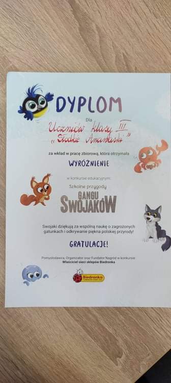 W dniu 17 stycznia 2022 roku Jury konkursowe ogłosiło, iż klasa III znalazła się w gronie 450 wyróżnionych w konkursie edukacyjnym Szkolne Przygody Gangu Swojaków pt. Gatunki zwierząt zagrożonych i chronionych w naszej małej ojczyźnie, który został zorganizowany przez sieć sklepów Biedronka. W nagrodę za wykonanie pracy przez uczniów i przesłanie jej przez wychowawcę, Joannę Ściegienną do organizatora, klasa otrzymała certyfikat uczestnictwa w programie edukacyjnym, a każdy uczeń - maskotkę Swojaka oraz dyplom, będący wyróżnieniem za wkład w pracę zbiorową. Konkurs był impulsem do aktywnego i kreatywnego poznawania polskiej natury i zagrożonych gatunków zwierząt.