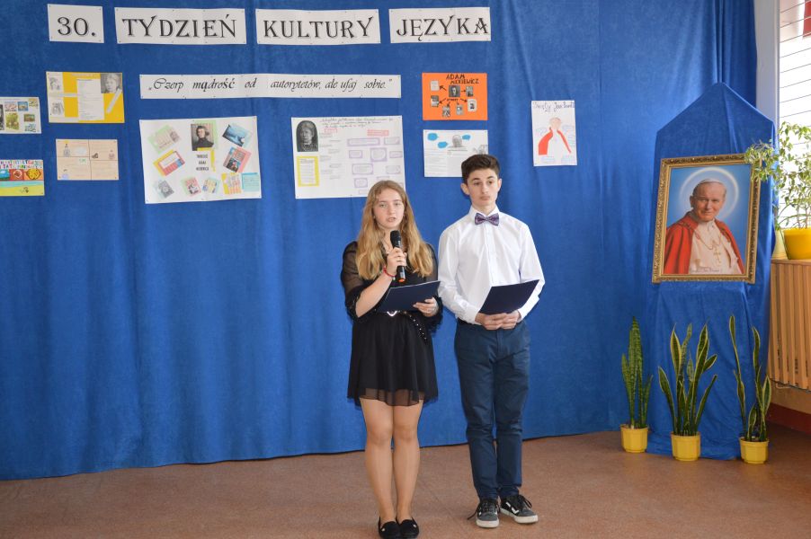 W dniach 14. 03.- 18. 03. 2022 r. odbył się w naszej szkole XXX Jubileuszowy Tydzień Kultury Języka. Tegoroczne hasło Tygodnia brzmiało: Czerp mądrość od autorytetów, ale ufaj sobie. W realizowanych działaniach uczestniczyli uczniowie klas I – VIII oraz oddziału przedszkolnego. Odbywały się m.in. konkursy recytatorskie, konkurs literacki, konkurs przysłów, konkursy plastyczne, prezentacje o postaciach Polaków, które mogą stać się autorytetami dla młodych ludzi w formie zabaw, krzyżówek, rebusów, kalamburów z elementami rywalizacji, konkurs ortograficzny dla rodziców, quizy, gry i zabawy związane z wybitnymi Polakami. Staramy się na każdym kroku zachęcać uczniów do myślenia i dokonywania właściwych życiowych wyborów oraz czerpania mądrości z autorytetów. Celem podjętych działań było m.in. przygotowanie ucznia do świadomego dokonywania życiowych wyborów, uczestnictwa w kulturze poprzez udział w różnych formach ekspresji kulturalnej, rozwijanie kompetencji językowych oraz upowszechnianie posługiwania się poprawną polszczyzną, propagowanie kultury języka w różnych sytuacjach życiowych, kształtowanie estetyki i formy wypowiedzi w sytuacjach codziennych i publicznych oraz ocalenie od zapomnienia sztuki pisania listów, ze szczególnym zwróceniem uwagi na estetyczny, poprawny i czytelny zapis treści listu.