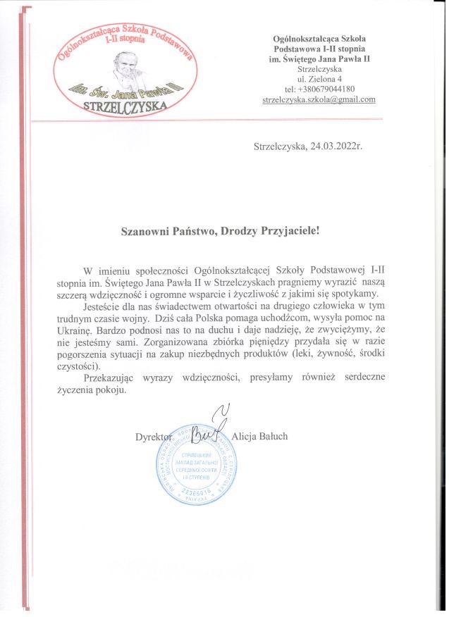 W związku z wybuchem wojny na Ukrainie i ciężką sytuacją w tym państwie dyrektor naszej szkoły nawiązał kontakt z Zespołem Edukacyjnym z Polskim Językiem Nauczania im. Jana Pawła II w Strzelczyskach i zaoferował szkole mającej tego samego patrona pomoc finansową.