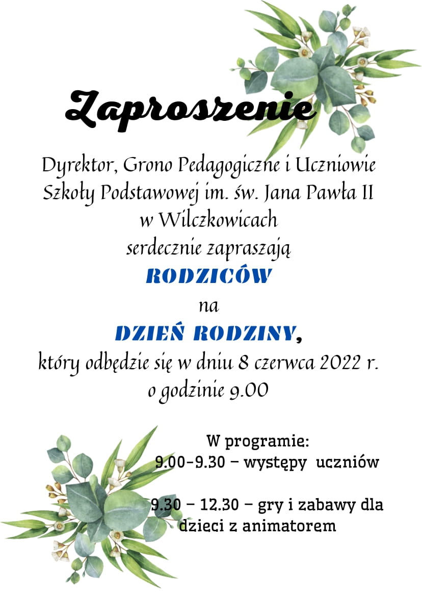 ZAPROSZENIE NA DZIEŃ RODZINY Źródło zdjęcia: https://pl.pinterest.com/karolinapb85/zaproszenia/ Zdjęcia Załączniki Zaproszenie dzień rodziny [781.69 kB] Zaproszenie dzień rodziny-1 [99.10 kB] Zobacz również GMINNY DZIEŃ DZIECKA ŚWIATOWY DZIEŃ PSZCZÓŁ W ODDZIALE PRZEDSZKOLNYM EGZAMIN ÓSMOLASISTÓW ZAPROSZENIE NA DZIEŃ RODZINY ŻYCZENIA Z OKAZJI DNIA MATKI WARSZTATY KREATYWNE DLA PIERWSZAKÓW 25 maja 2022 Aktualności Wydrukuj Udostępnij Wyświetlono: 455