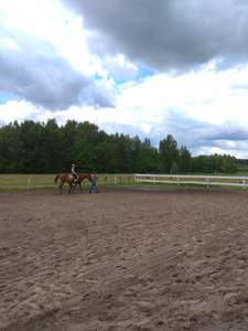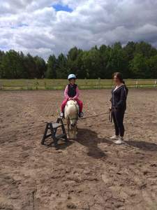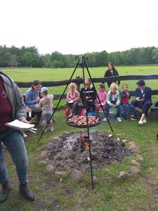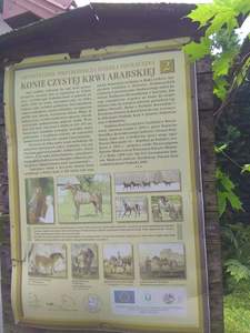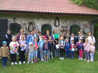 Na początek tej niepowszedniej wizyty wszyscy zostali zapoznani z regulaminem poruszania się po obiekcie i zasadami zachowania wobec przebywających na terenie zwierząt, a zwłaszcza z ryzykiem, jakie niesie kontakt z dużym i płochliwym zwierzęciem, jakim jest koń. Pani przewodnik dokonała tego w sposób adekwatny do percepcji małych dzieci, wielokrotnie zapytując: „Jak sądzicie?” Dzieci zwiedziły zagrodę kóz i bliźniaków kozłów, klatkę królika. Niemałą frajdę sprawiło im karmienie zwierzaków marchewkami. Duże zainteresowanie wzbudziły domki dla motyli, pszczół i innych owadów, budki lęgowe dla ptaków, domki dla nietoperzy i gniazda jaskółek. Dzieci obejrzały kurnik, w którym rządzi niezwykły kogut Julian. Nawet studnia typu żuraw okazała się ciekawostką. Legenda o koniach arabskich wzbudziła ciekawość. Zwiedzanie stajni okazało się niecodziennym przeżyciem. Dzieci cieszyły się, że zastały w boksach klacze ze źrebiętami i mogły pogłaskać młode. Na dzieciach duże wrażenie zrobiła prezentacja autentycznych siodeł kowbojskich. Największą atrakcją była oczywiście przejażdżka na koniu dużym lub małym. Dla większości dzieci było to pierwsze takie doświadczenie. Obserwujące mamy cieszyły się wspólnie ze swoimi pociechami z ich szczególnych wrażeń. Po zajęciach na wszystkich czekało ognisko oraz poczęstunek z kiełbaskami i ciastem. Zabawa dzieci kontynuowana była na placu zabaw. Wspaniałą niespodzianką okazało się puszczanie ogromnych baniek mydlanych na sznurkach. Na zakończenie cała grupa odbyła spacer uroczą aleją grabową nad jeden z czterech stawów. Tam mali przyrodnicy podziwiali lilie wodne i maleńkie żabki.
