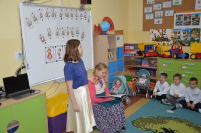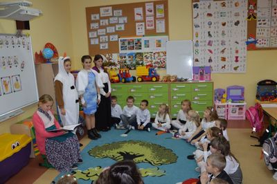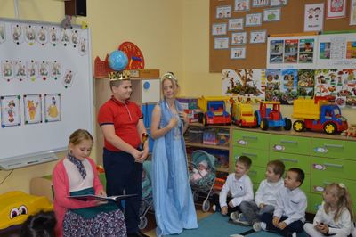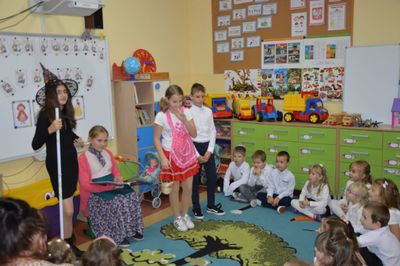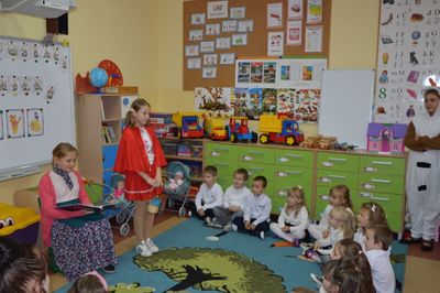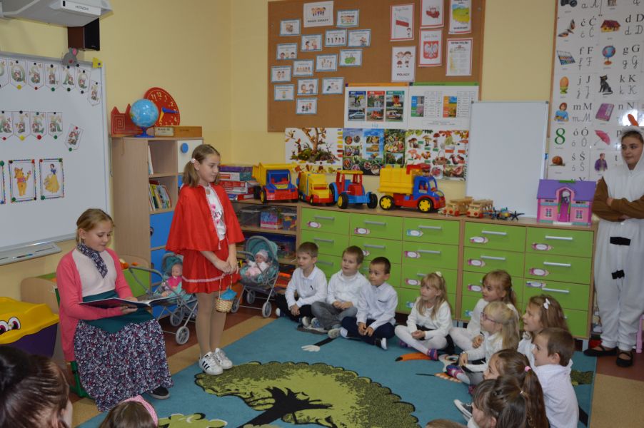 Z tej okazji dzieci z oddziału przedszkolnego wyruszyły w podróż do krainy bajek. Był to dzień kolorowy i wesoły! Dzieci uczestniczyły w konkursach i quizach. Wysłuchały fragmentów utworów znanych bajek, a następnie podawały z jakiej bajki pochodzą. Trafnie przyporządkowywały bajkowe rekwizyty do postaci z bajek.