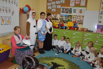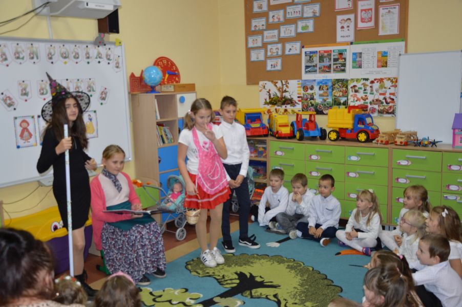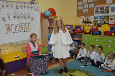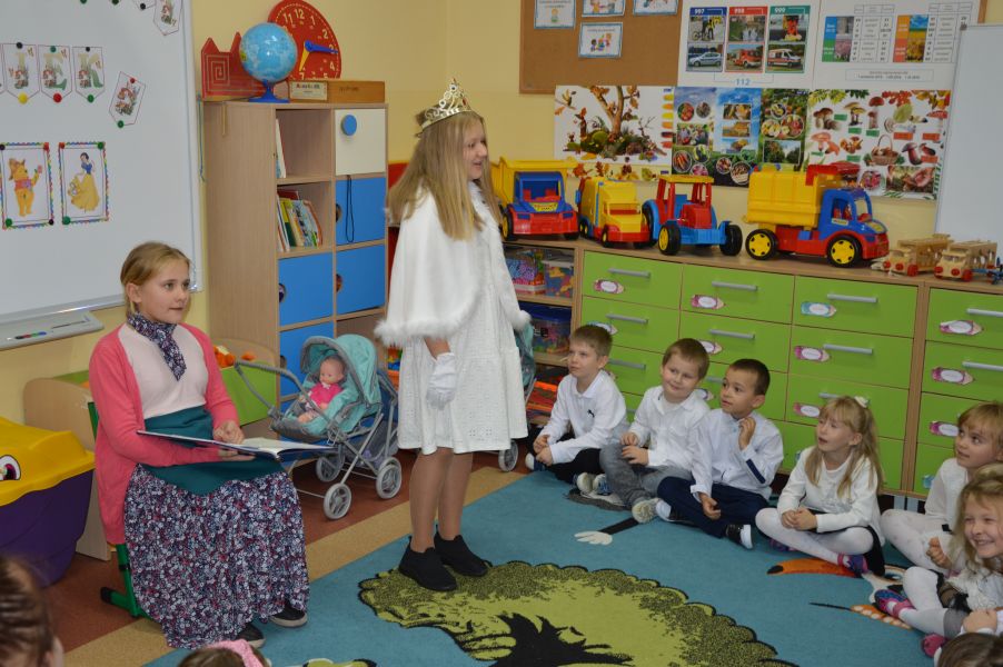 Jednak najbardziej wyczekiwanym momentem dla naszych najmłodszych milusińskich był fakt spotkania się z postaciami wybranych bajek, baśni i legend w przedstawieniu wystawionym przez uczniów klasy V pod kierunkiem wychowawczyni p. Wiesławy Zbróg. Zaprezentowali się w bajkowych przebraniach m.in. Czerwonego Kapturka, Kota w butach, Jasia i Małgosi, Królewny Śnieżki, Śpiącej Królewny, Królowej Śniegu, Szewczyka Dratewki, Elsy, Anny i Olafa czytając po fragmencie bajki, baśni lub legendy przez babcię, a zadaniem przedszkolaków było odgadnięcie co to była za bajka, baśń czy legenda.