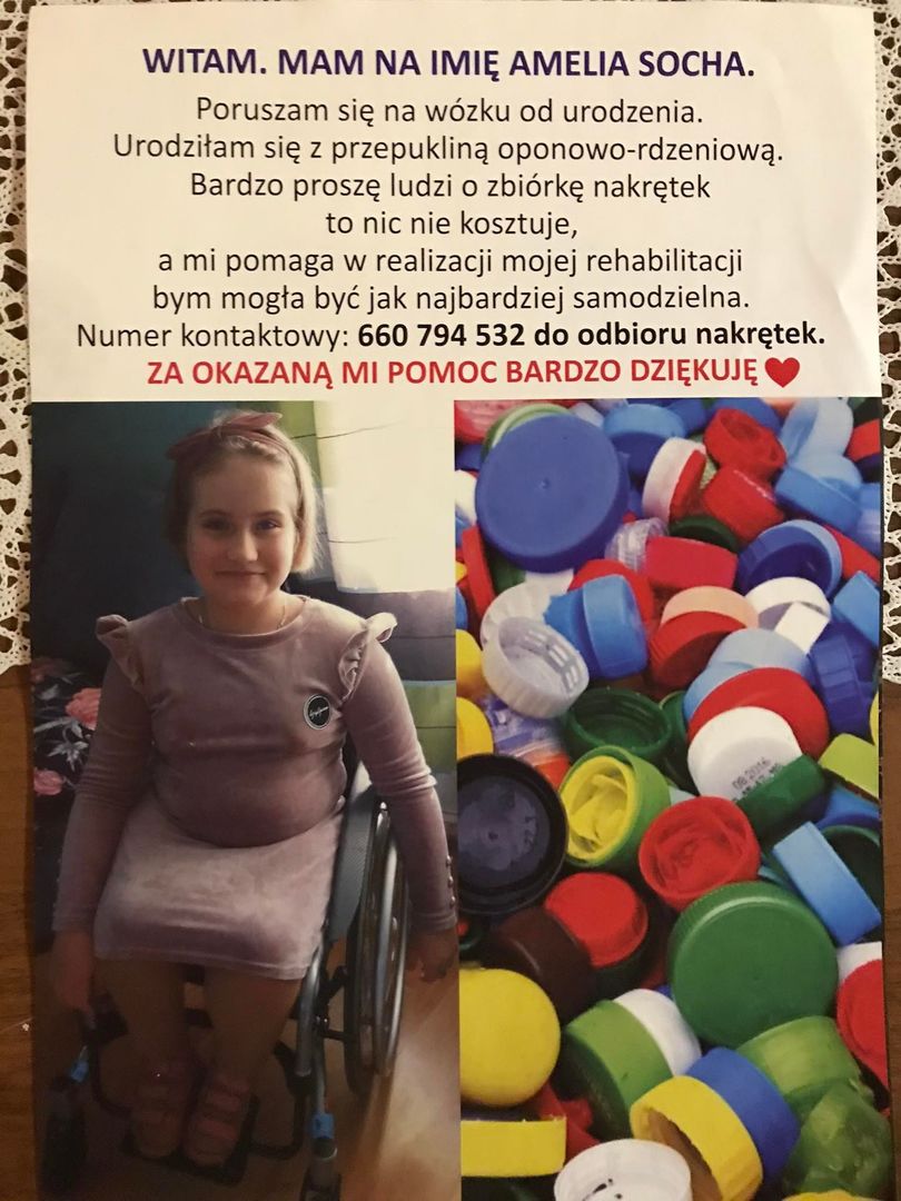 Z tą wadą urodziła się Amelka Socha - mieszkanka wsi Łysów w gminie Radoszyce. Amelka oprócz wspomnianej przepukliny choruje też na wodogłowie i porażenie kończyn dolnych. Zmaga się również z pęcherzem neurogennym co sprawia, że musi być cewnikowana co 3 godziny. W minionym roku szkolnym nasi uczniowie ochoczo włączyli się w pomoc Amelce, biorąc czynny udział w akcji zbierania dla niej plastikowych nakrętek. Szkolne Koło PCK wraz z opiekunem i w porozumieniu z rodziną Amelki, postanowiło i tym razem stanąć na wysokości zadania, organizując kolejną zbiórkę. Zbiórka nakrętek jest pomysłem sprawdzonym. Wyrabia systematyczny nawyk segregowania odpadów, jakże potrzebny dzisiejszych czasach. Ponadto daje poczucie, że możemy zrobić coś dobrego dla potrzebujących. To charytatywno - ekologiczne działanie, polegające na łączeniu przyjemnego z pożytecznym.