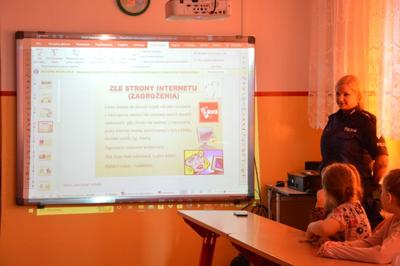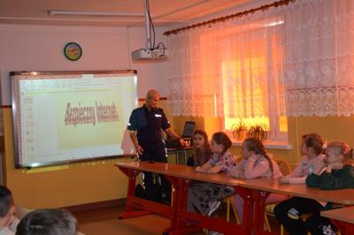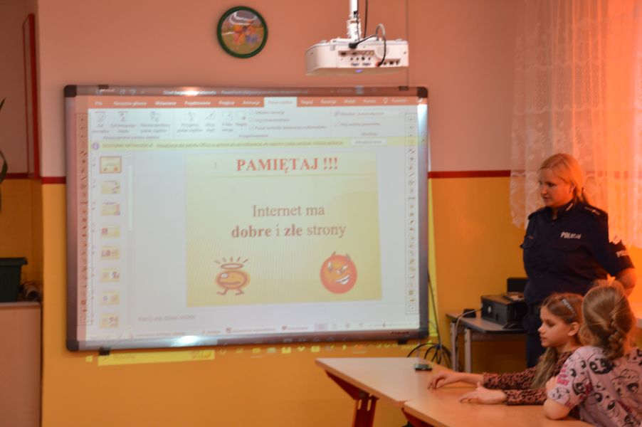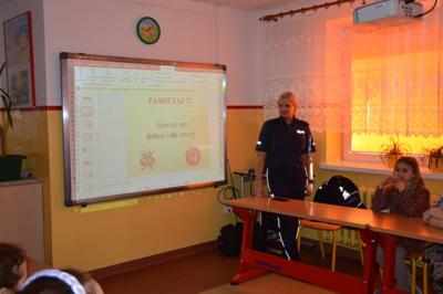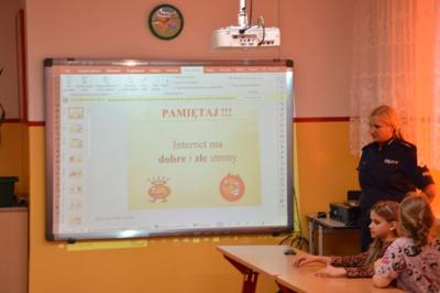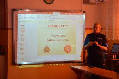 Policjantka dużo mówiła również o odpowiedzialności prawnej nieletnich, agresji i przemocy wobec rówieśników i pracowników szkoły oraz zasad zachowania się obowiązujących w szkole i poza nią. Podczas spotkania wyjaśniła uczniom wiele pojęć związanych ze zjawiskiem przemocy w sieci, jak również czego nie mogą i nie powinni robić korzystając z internetu.