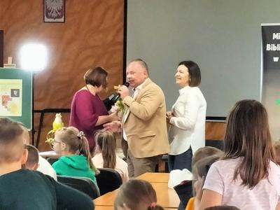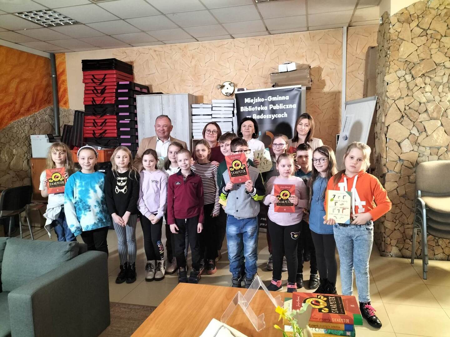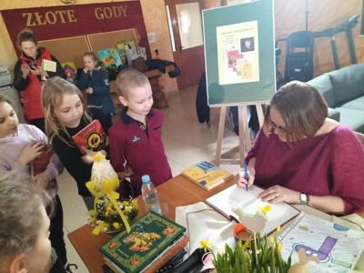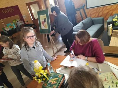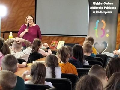 W dniu 29 marca w sali konferencyjnej Urzędu Miasta i Gminy w Radoszycach odbyło się spotkanie z autorką książek dla dzieci - panią Justyną Bednarek. Pisarka ma na swoim koncie wiele książek dla dzieci- w tym kultową pozycję znajdującą się na liście lektur klas I-III - "Niesamowite przygody dziesięciu skarpetek". Pani Bednarek opowiadała dzieciom niezwykłe historie z własnego życia, które stały się inspiracją do napisania książki. Dzieci z ciekawością słuchały tych opowieści, a gdy tylko miały taką możliwość, zadawały autorce wiele pytań. Pani Justyna zachęciła zebranych do poznania pozostałych części przygód skarpetek oraz innych książek swojego autorstwa poprzez przeczytanie słuchaczom ich fragmentów. Następnie, w przygotowanym przez autorkę quizie, mali czytelnicy odpowiadali na pytania z lektury. To tylko potwierdziło, że doskonale znają tematykę i treść omawianej książki. Na koniec wszyscy uczestnicy mieli możliwość uzyskania autografu od pisarki i zrobienia sobie z nią pamiątkowego zdjęcia. Spotkanie zostało zorganizowane przez Miejsko- Gminną Bibliotekę Publiczną w Radoszycach oraz pana burmistrza Michała Pękalę. Uczniowie klasy drugiej pierwszy raz uczestniczyli w takich rozmowach, dlatego ten dzień z pewnością na długo zostanie w ich pamięci.