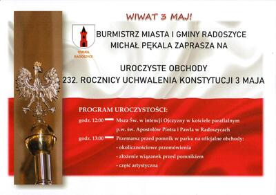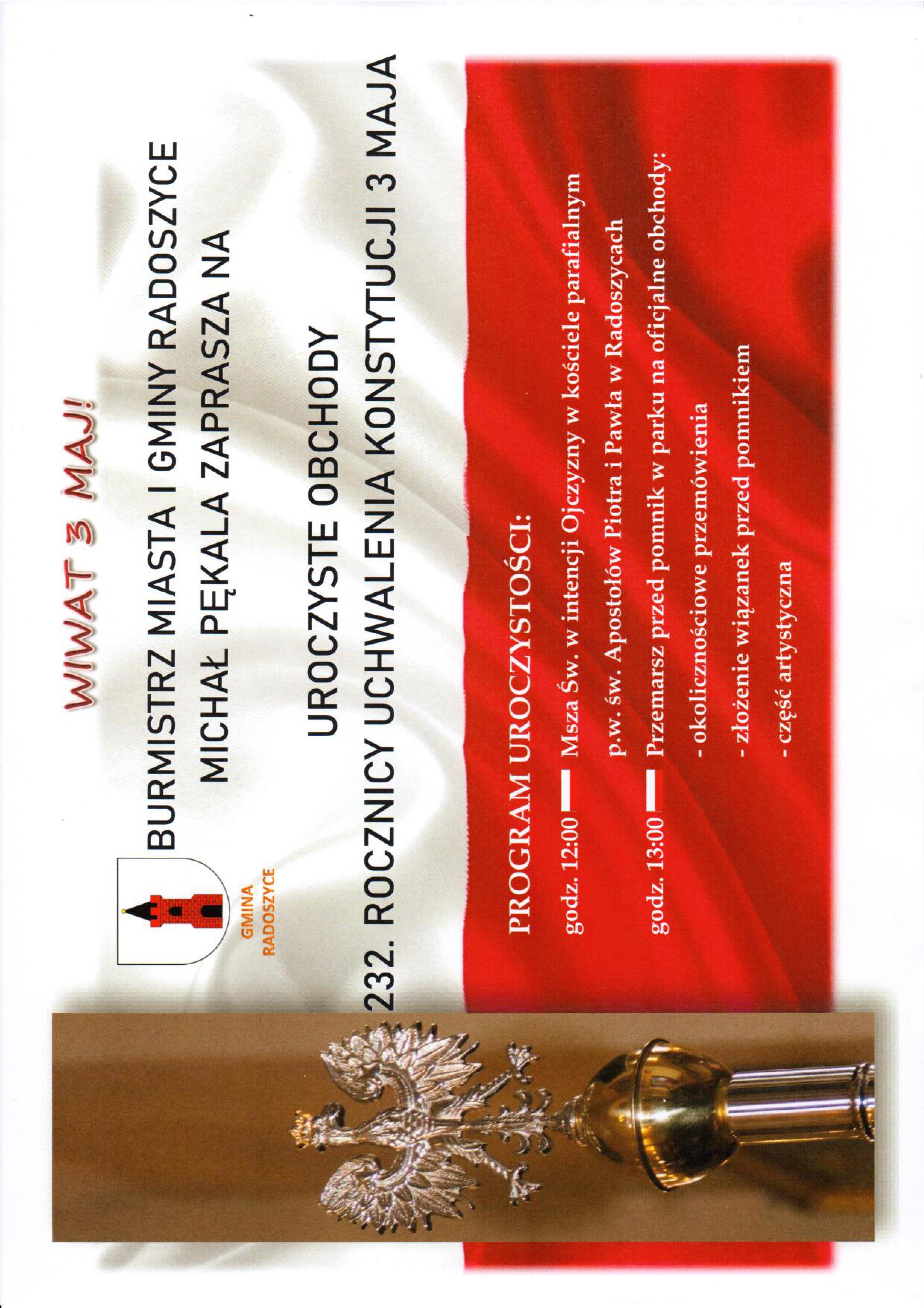 ZAPROSZENIE NA UROCZYSTE OBCHODY 232. ROCZNICY UCHWALENIA KONSTYTUCJI 3 MAJA
