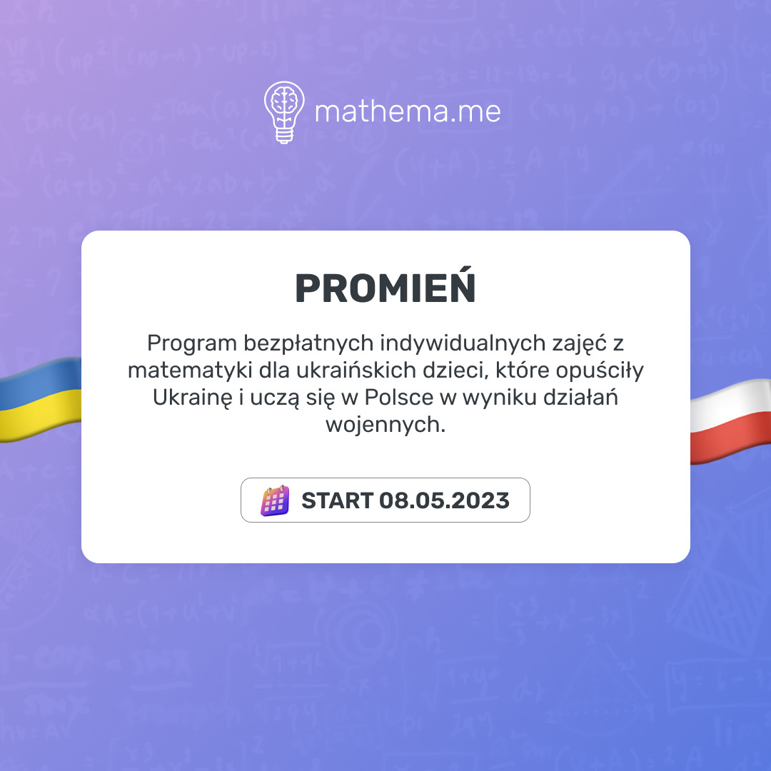 Ukraińska matematyczna Szkoła online Mathema rusza z projektem „Promień”. Jest to program bezpłatnych indywidualnych zajęć z matematyki dla ukraińskich dzieci, które czasowo opuściły Ukrainę i uczą się w Polsce.
