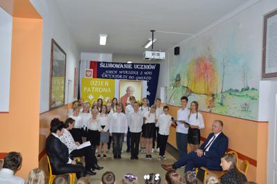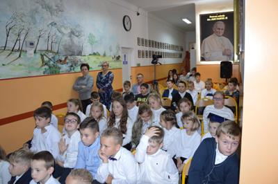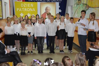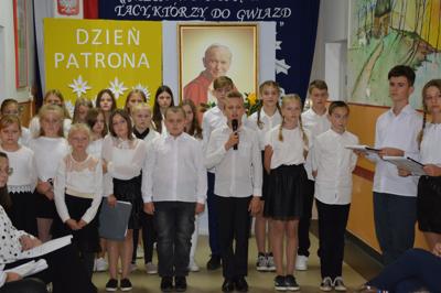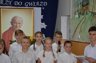 W części artystycznej przygotowanej pod kierunkiem pań: Barbary Janus i Krystyny Kowalczyk wystąpili uczniowie klas IV-VIII. Przygotowany montaż słowno-muzyczny był po to, aby uczcić naszego Patrona i skłonić nas do refleksji i wdzięczności za to, że Ojciec Święty był i nadal jest wśród nas wielką osobowością i na zawsze pozostanie w naszej pamięci wzorem do naśladowania. Nasz Patron był wrażliwy na każdego człowieka, ale przede wszystkim na poruszenia Ducha Świętego, dlatego sięgnęliśmy pamięcią do jego I pielgrzymki do Ojczyzny w czerwcu w 1979 roku, kiedy wypowiedział do nas bardzo ważne słowa: „Niech zstąpi Duch Twój i odnowi oblicze ziemi”.