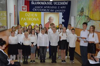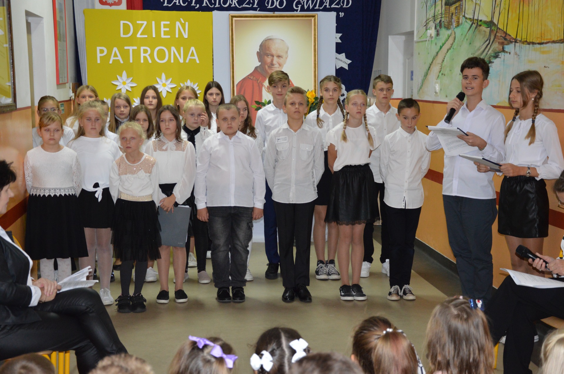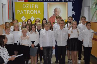 W dniu 16 października 2023 roku kolejny już raz obchodziliśmy w naszej szkole Dzień Patrona. To święto całej społeczności szkolnej, to dzień szczególny – to pamięć, oddanie i zjednoczenie z Patronem szkoły, którym jest św. Jan Paweł II. Już od 5 lat przeżywamy to szczególne wydarzenie nadania naszej szkole imienia św. Jana Pawła II.