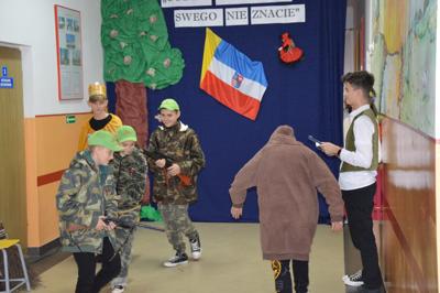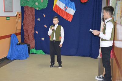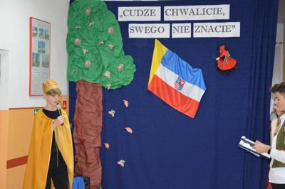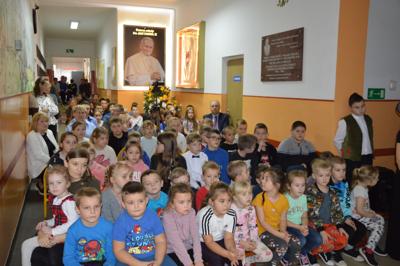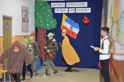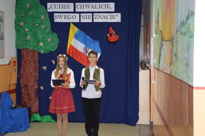 W dniu 23. 11. 2023 roku odbyły się w naszej placówce dwa istotne wydarzenia. O godzinie 11. 30 uczniowie klas IV-VII wystąpili na akademii szkolnej, która była podsumowaniem realizowanej innowacji pedagogicznej pt. „Cudze chwalicie, swego nie znacie”. Koordynatorami projektu były: pani Krystyna Kowalczyk – nauczyciel historii, pani Wiesława Zbróg – nauczyciel geografii i pani Barbara Janus – nauczyciel języka polskiego. Projekt trwał od kwietnia do listopada 2023 roku. W tym czasie uczniowie klas IV-VII poznawali walory i piękno województwa świętokrzyskiego. Zostali zapoznani z historią, zabytkami oraz warunkami przyrodniczo – geograficznymi województwa. Zorganizowano w tym czasie dwie wycieczki. Pierwsza odbyła się w maju na Święty Krzyż oraz do Kielc, natomiast druga miała miejsce we wrześniu do Sandomierza. Uczniowie dzięki tym wyjazdom mieli okazję poznać legendy oraz zabytki Kielc i Sandomierza, poszerzając swoją wiedzę na temat naszego regionu. W szkole przeprowadzono konkurs plastyczny pt. „Świętokrzyskie jakie cudne” oraz quizy wiedzy „Co wiem o województwie świętokrzyskim”.