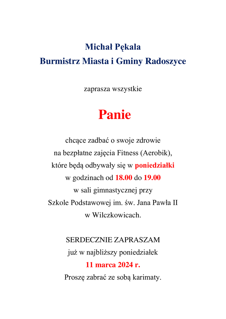 ZAPROSZENIE DLA PAŃ NA ZAJĘCIA FITNESS (AEROBIK)