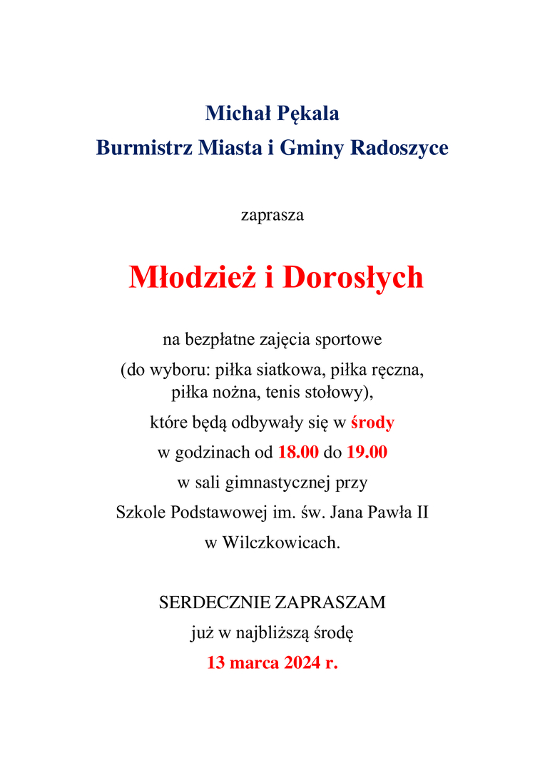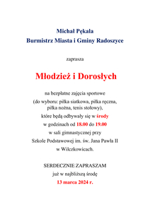 ZAPROSZENIE DLA MŁODZIEŻY I DOROSŁYCH NA ZAJĘCIA SPORTOWE