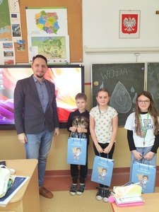 W związku z udziałem w przedsięwzięciu dnia 12 marca naszą szkołę odwiedził pan Bartosz Jastrzębski - koordynator programu „Aktywni Błękitni" z Regionalnego Zarządu Gospodarki Wodnej w Krakowie. Uczniowie klasy trzeciej podczas zajęć edukacyjnych dowiedzieli się, jakie są zasoby wody pitnej na Ziemi oraz poznali sposoby jej oszczędzania, które mogą wprowadzić w swoim codziennym życiu. Celem przeprowadzenia zajęć było wykształcenie wśród dzieci poprawnych nawyków i postaw. Wraz z otrzymaną wiedzą będą mogły je wykorzystywać w przyszłości i przekazywać dalej, przyczyniając się do ochrony środowiska.